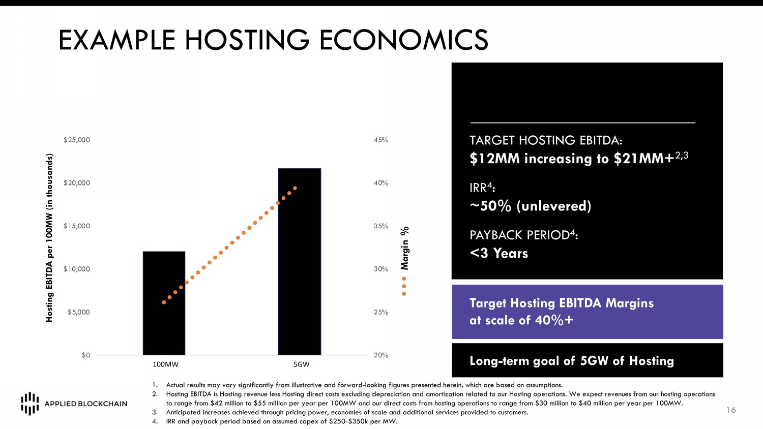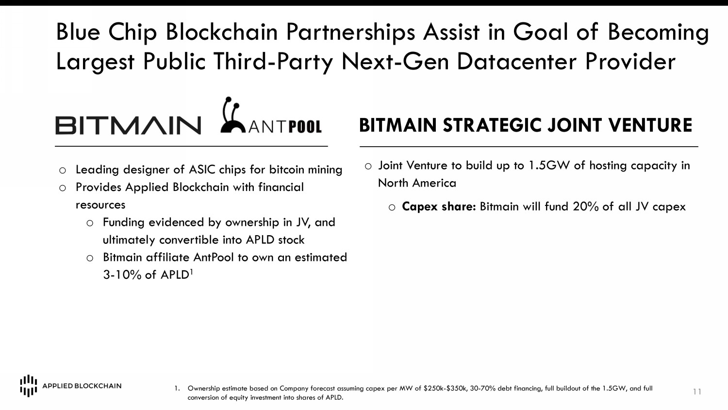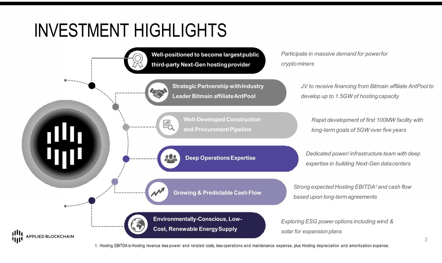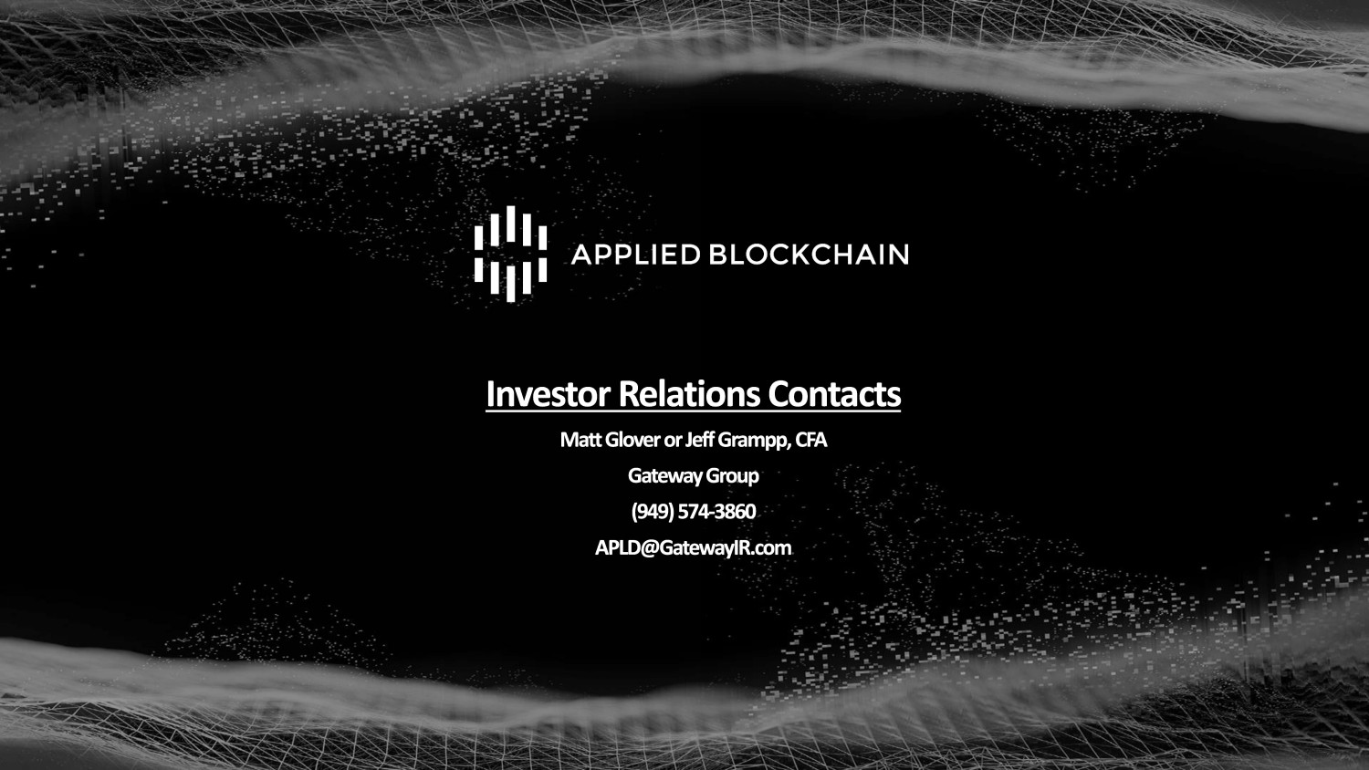 DISCLAIMER This presentation has been designed to provide general information about Applied Blockchain, Inc. (“APLD” or the “Company”). Any information contained or referenced herein is suitable only as an introduction to the Company. The information contained in this presentation is for informational purposes only. The information contained in this presenta tio n is not investment or financial product advice and is not intended to be used as the basis for making an investment decision . Neither the Company or any of its affiliates make any representation or warranty, express or implied as to, and no reliance s hou ld be placed on, the fairness, accuracy, completeness or correctness of any of the information or opinions contained in this presentation. This presentation has been prepared without taking into account the investment objectives, financial situation par ticular needs of any particular person. The trademarks included herein are the property of the owners thereof and are used for reference purposes only. Such use shou ld not be construed as an endorsement of the platform and solutions of Applied Blockchain. Forward - Looking Statements This presentation contains forward - looking statements that reflect the Company’s current expectations and projections with respect to, among other things, its financial condition, results of operations, plans, objectives, future performance and business . When used in this presentation, the words “could,” “believe,” “anticipate,” “intend,” “estimate,” “expect,” “project” and similar expressions are intended to identify forward - looking statements, although not all forward - looking statements contain such identifying words . Forward - looking statements include all statements that are not historical facts . Forward - looking statements are based on information available at the time those statements are made and/or management’s good faith beliefs and assumptions as of that time with respect to future events . Such forward - looking statements are subject to various risks and uncertainties . Accordingly, there are or will be important factors that could cause actual outcomes or results to differ materially from those indicated in these statements . Forward - looking statements may include statements about the Company’s future financial performance, including the Company’s expectations regarding net revenue, operating expenses, and its ability to achieve and maintain future profitability ; the Company’s business plan and ability to effectively manage growth ; anticipated trends, growth rates, and challenges in the Company’s business, the cryptoeconomy, and in the markets in which the Company operates ; further development and market acceptance of cryptoasset networks and other cryptoassets ; further development of the Company’s co - hosting facilities and customer base for co - hosting services ; beliefs and objectives for future operations ; the value of Bitcoin, Ether and other cryptoassets, which may be subject to pricing risk has historically been subject to wide swings ; the Company’s expectations concerning relationships with third parties ; the effects of increased competition in the Company’s markets and the Company’s ability to compete effectively ; the Company’s ability to stay in compliance with laws and regulations that currently apply or become applicable to its business both in the United States and internationally ; economic and industry trends, projected growth, or trend analysis ; trends in revenue, cost of revenue, and gross margin ; trends in operating expenses, including technology and development expenses, sales and marketing expenses, and general and administrative expenses, and expectations regarding these expenses as a percentage of revenue ; increased expenses associated with being a public company ; and other statements regarding the Company’s future operations, financial condition, and prospects and business strategies . There is no assurance that any forward - looking statements will materialize . You are cautioned not to place undue reliance on forward - looking statements, which reflect expectations only as of this date . Applied Blockchain undertakes no obligation to publicly update or review any forward - looking statement, whether as a result of new information, future developments or otherwise . Market and Industry Data This presentation includes information concerning economic conditions, the Company’s industry, the Company’s markets and the Company’s competitive position that is based on a variety of sources, including information from independent industry analysts and publications, as well as Applied Blockchain’s own estimates and research . Applied Blockchain’s estimates are derived from publicly available information released by third party sources, as well as data from its internal research, and are based on such data and the Company’s knowledge of its industry, which the Company believes to be reasonable . Any independent industry publications used in this presentation were not prepared on the Company’s behalf . This information involves many assumptions and limitations, and you are cautioned not to give undue weight to these estimates . The Company has not independently verified the accuracy or completeness of the data contained in these industry publications and other publicly available information . Accordingly, we make no representations as to the accuracy or completeness of that data nor do we undertake to update such data after the date of this presentation . An investment in the Company entails a high degree of risk and no assurance can be given that the Company’s objective will be achieved or that investors will receive a return on their investment . Recipients of this presentation should make their own investigations and evaluations of any information referenced herein . 2