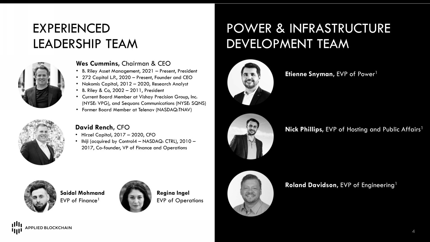 INVESTMENT HIGHLIGHTS 3 Strategic Partnership with Industry Leader Bitmain affiliate AntPool JV to receive financing from Bitmain affiliate AntPool to develop up to 1.5GW of hosting capacity Dedicated power/ infrastructure team with deep expertise in building Next - Gen data centers Rapid development of first 100MW facility with long - term goals of 5GW over five years Strong expected Hosting EBITDA 1 and cash flow based upon long - term agreements Well - Developed Construction and Procurement Pipeline Exploring ESG power options including wind & solar for expansion plans Growing & Predictable Cash Flow Deep Operations Expertise Well - positioned to become largest public third - party Next - Gen hosting provider Participate in massive demand for power for crypto miners 1. Hosting EBITDA is Hosting revenue less power and related costs, less operations and maintenance expense, plus Hosting depreci ati on and amortization expense.
