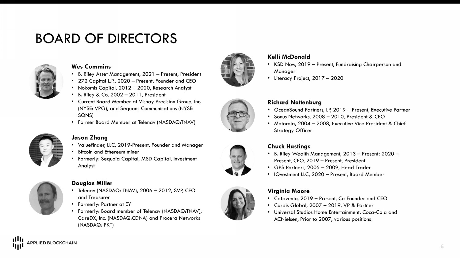 EXPERIENCED LEADERSHIP TEAM 4 POWER & INFRASTRUCTURE DEVELOPMENT TEAM Wes Cummins, Chairman & CEO • B. Riley Asset Management, 2021 – Present, President • 272 Capital L.P., 2020 – Present, Founder and CEO • Nokomis Capital, 2012 – 2020, Research Analyst • B. Riley & Co, 2002 – 2011, President • Current Board Member at Vishay Precision Group, Inc. (NYSE: VPG), and Sequans Communications (NYSE: SQNS) • Former Board Member at Telenav (NASDAQ:TNAV) David Rench, CFO • Hirzel Capital, 2017 – 2020, CFO • Ihiji (acquired by Control4 – NASDAQ: CTRL), 2010 – 2017, Co - founder, VP of Finance and Operations Etienne Snyman, EVP of Power 1 Nick Phillips, EVP of Hosting and Public Affairs 1 Roland Davidson, EVP of Engineering 1 Saidal Mohmand EVP of Finance 1 Regina Ingel EVP of Operations