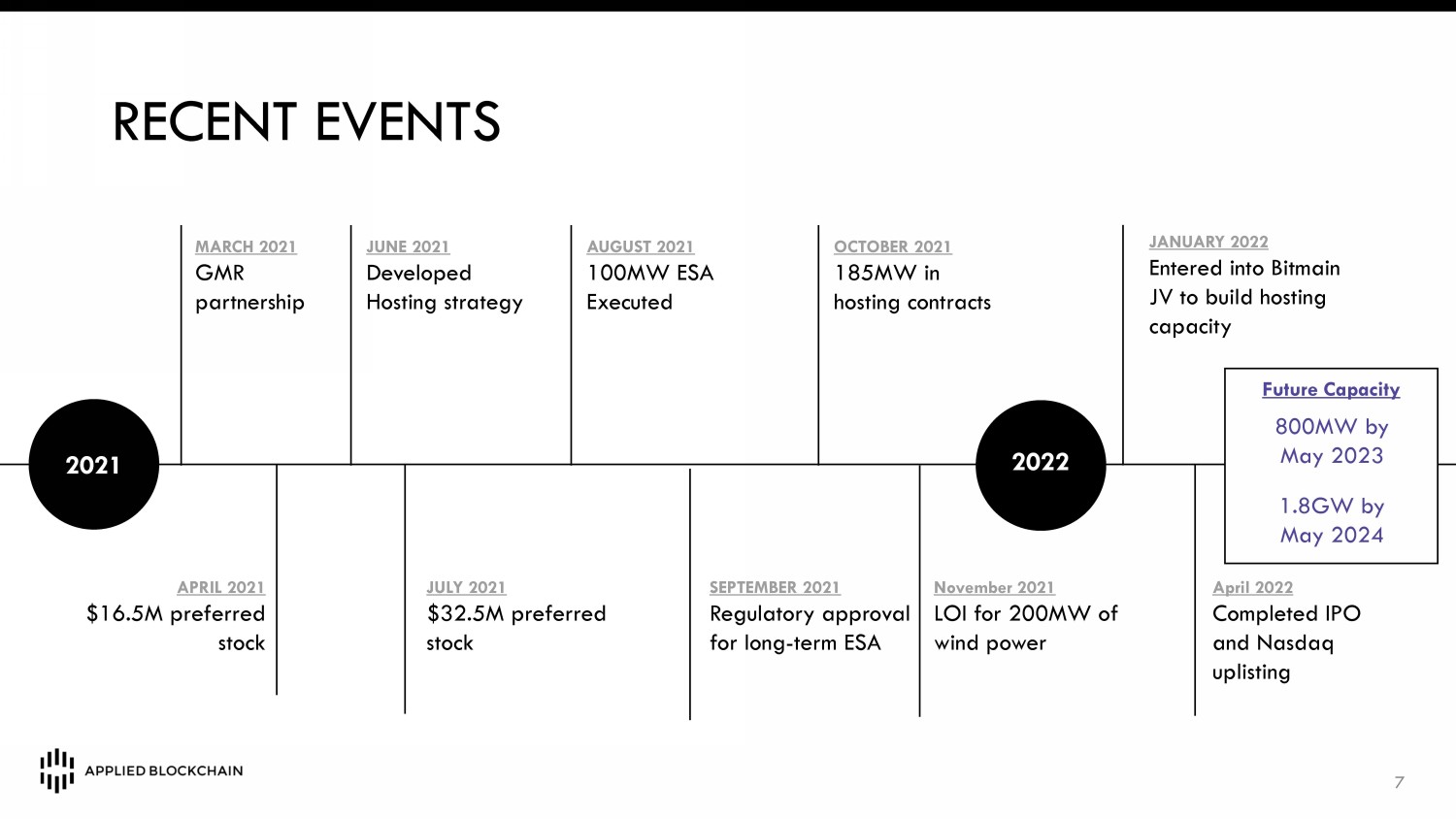RECENT EVENTS 7 2021 2022 MARCH 2021 GMR partnership APRIL 2021 $16.5M preferred stock JUNE 2021 Developed Hosting strategy JULY 2021 $32.5M preferred stock AUGUST 2021 100MW ESA Executed SEPTEMBER 2021 Regulatory approval for long - term ESA OCTOBER 2021 185MW in hosting contracts 800MW by May 2023 1.8GW by May 2024 Future Capacity November 2021 LOI for 200MW of wind power JANUARY 2022 Entered into Bitmain JV to build hosting capacity April 2022 Completed IPO and Nasdaq uplisting