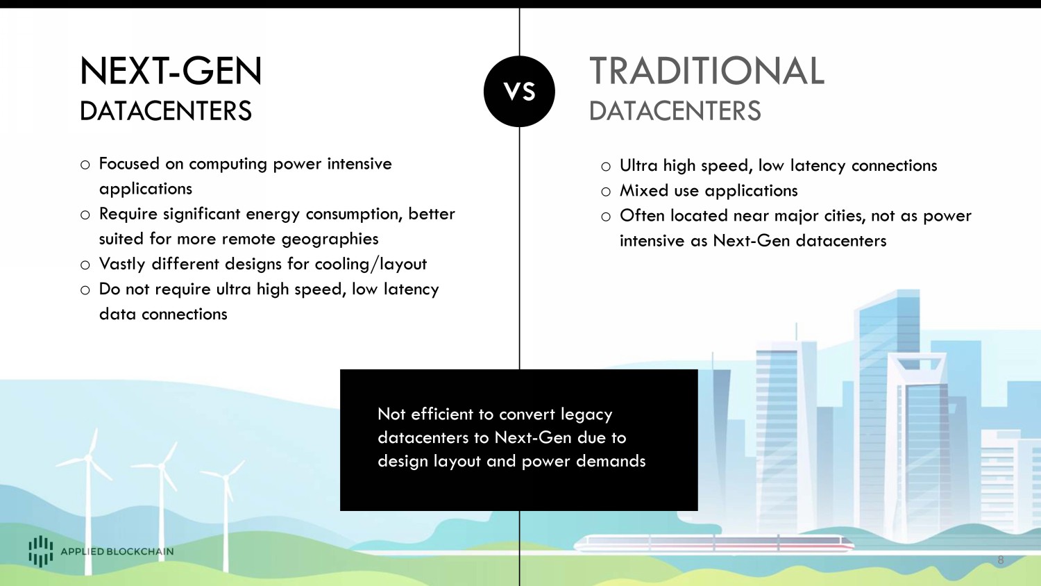 NEXT - GEN DATACENTERS o Focused on computing power intensive applications o Require significant energy consumption, better suited for more remote geographies o Vastly different designs for cooling/layout o Do not require ultra high speed, low latency data connections 8 o Ultra high speed, low latency connections o Mixed use applications o Often located near major cities, not as power intensive as Next - Gen datacenters TRADITIONAL DATACENTERS vs Not efficient to convert legacy datacenters to Next - Gen due to design layout and power demands