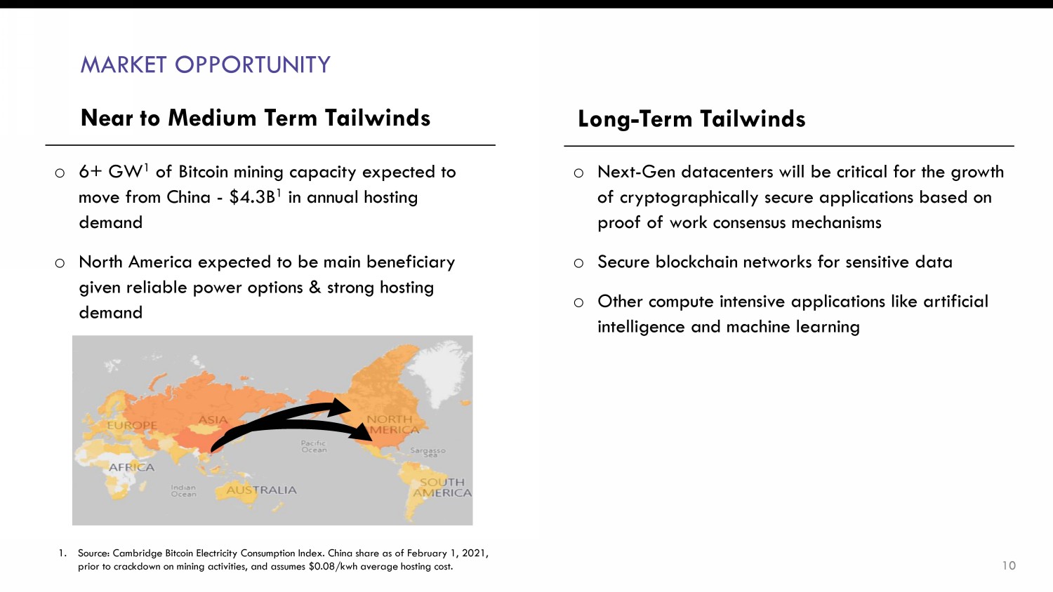 MARKET OPPORTUNITY 10 o 6+ GW 1 of Bitcoin mining capacity expected to move from China - $4.3B 1 in annual hosting demand o North America expected to be main beneficiary given reliable power options & strong hosting demand Near to Medium Term Tailwinds Long - Term Tailwinds o Next - Gen datacenters will be critical for the growth of cryptographically secure applications based on proof of work consensus mechanisms o Secure blockchain networks for sensitive data o Other compute intensive applications like artificial intelligence and machine learning 1. Source: Cambridge Bitcoin Electricity Consumption Index. China share as of February 1, 2021, prior to crackdown on mining activities, and assumes $0.08/kwh average hosting cost.