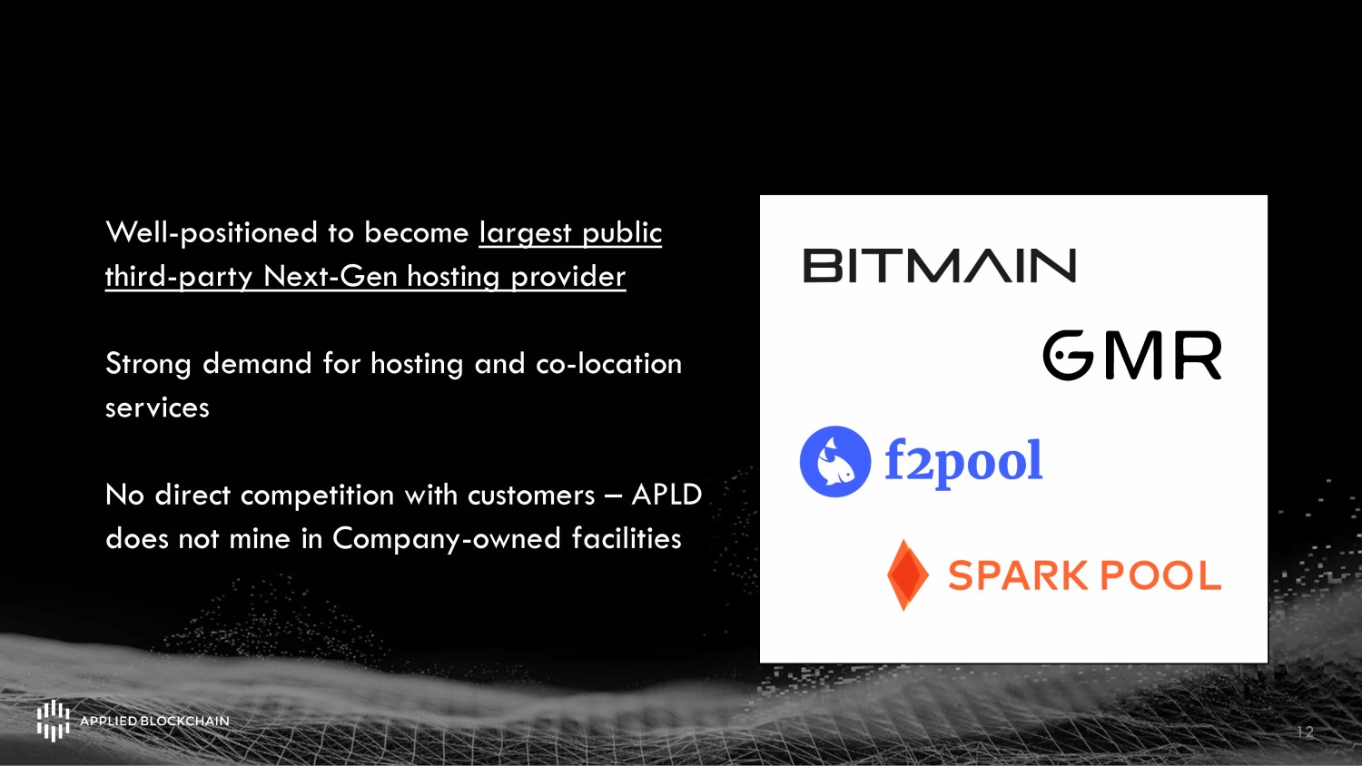 Blue Chip Blockchain Partnerships Assist in Goal of Becoming Largest Public Third - Party Next - Gen Datacenter Provider 11 o Leading designer of ASIC chips for bitcoin mining o Provides Applied Blockchain with financial resources o Funding evidenced by ownership in JV, and ultimately convertible into APLD stock o Bitmain affiliate AntPool to own an estimated 3 - 10% of APLD 1 o Joint Venture to build up to 1.5GW of hosting capacity in North America o Capex share: Bitmain will fund 20% of all JV capex BITMAIN STRATEGIC JOINT VENTURE 1. Ownership estimate based on Company forecast assuming capex per MW of $250k - $350k, 30 - 70% debt financing, full buildout of the 1 .5GW, and full conversion of equity investment into shares of APLD.