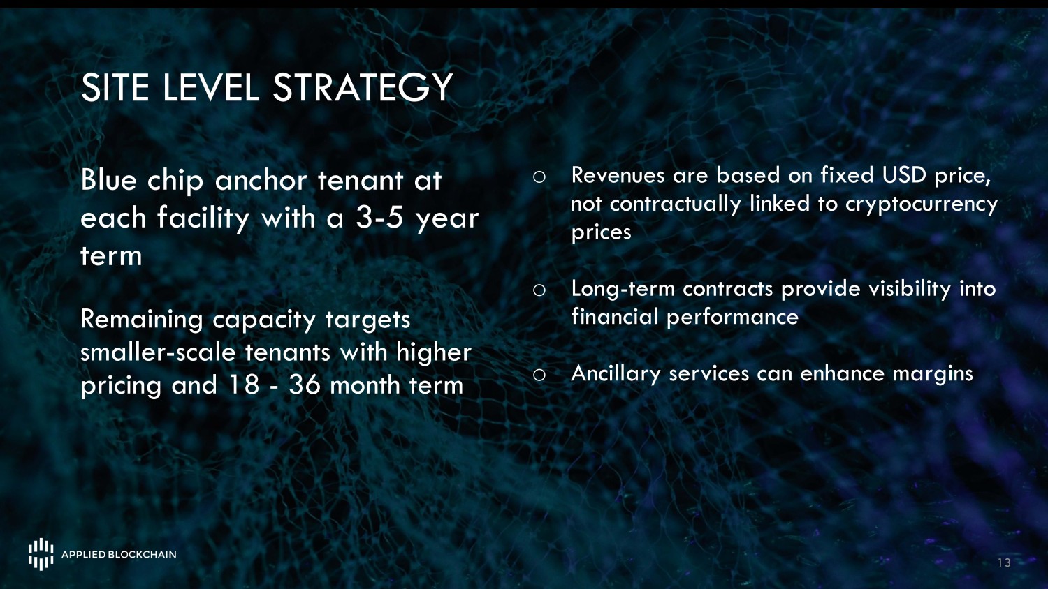 SITE LEVEL STRATEGY Blue chip anchor tenant at each facility with a 3 - 5 year term Remaining capacity targets smaller - scale tenants with higher pricing and 18 - 36 month term 13 o Revenues are based on fixed USD price, not contractually linked to cryptocurrency prices o Long - term contracts provide visibility into financial performance o Ancillary services can enhance margins