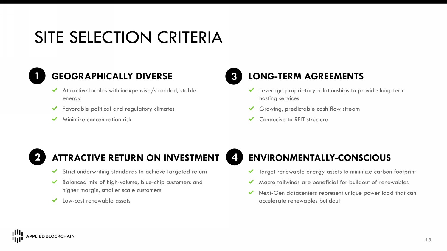 LARGE, DIVERSIFIED CONSTRUCTION & PROCUREMENT PIPELINE 14 55MW currently online, 100MW expected online in 1H22 Planned expansion requires construction completion of additional buildings on our Jamestown, ND property and entry into second energy services agreement for 100MW by December 2022 Plans to lease or acquire sites and enter into energy services agreements by December 2022 to develop Next - Gen data center operations for calendar year 2023 JAMESTOWN PHASE 1 TEXAS WIND FARM 1 100MW TEXAS WIND FARM 2 OKLAHOMA SITE 2022 Development Plan JAMESTOWN PHASE 2 NORTH DAKOTA SITE 2 930MW 200MW 180MW 200MW 100MW 150MW 5GW over next five years 1.8GW over next two years