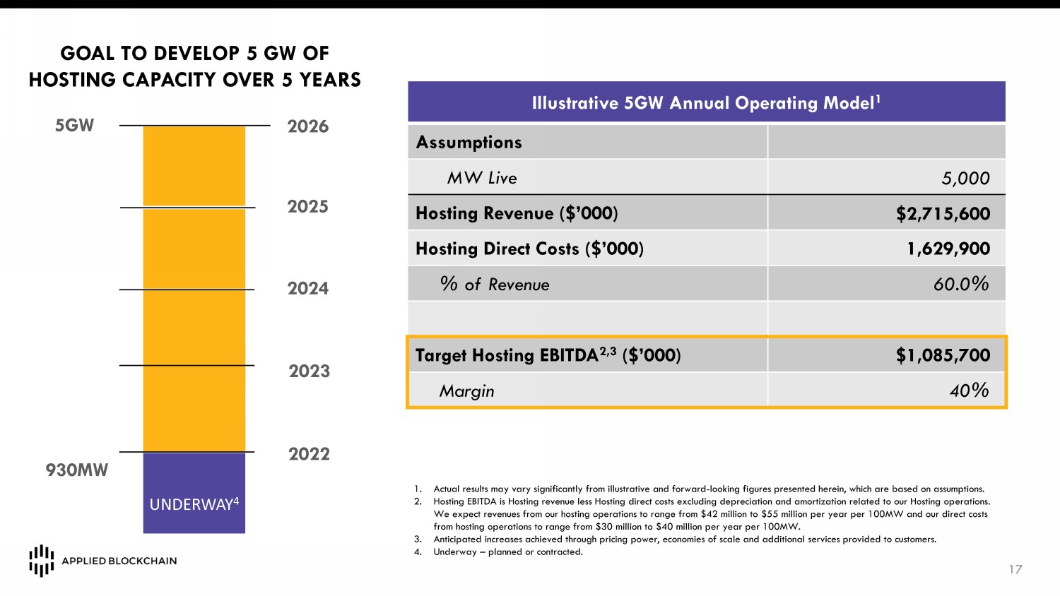 EXAMPLE HOSTING ECONOMICS 16 1. Actual results may vary significantly from illustrative and forward - looking figures presented herein, which are based on assumpt ions. 2. Hosting EBITDA is Hosting revenue less Hosting direct costs excluding depreciation and amortization related to our Hosting op era tions. We expect revenues from our hosting operations to range from $42 million to $55 million per year per 100MW and our direct costs from hosting operations to range from $30 mi lli on to $40 million per year per 100MW. 3. Anticipated increases achieved through pricing power, economies of scale and additional services provided to customers. 4. IRR and payback period based on assumed capex of $250 - $350k per MW. Target Hosting EBITDA Margins at scale of 40%+ Long - term goal of 5GW of Hosting TARGET HOSTING EBITDA: $12MM increasing to $21MM+ 2,3 IRR 4 : ~50% (unlevered) PAYBACK PERIOD 4 : <3 Years 20% 25% 30% 35% 40% 45% $0 $5,000 $10,000 $15,000 $20,000 $25,000 FY22E Jamestown FY27E 5GW M a r g i n % P r o j e c t E B I T D A p e r 1 0 0 M W Hosting EBITDA per 100MW (in thousands) 100MW 5GW