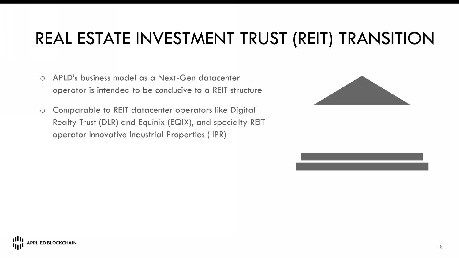 REAL ESTATE INVESTMENT TRUST (REIT) TRANSITION o APLD’s business model as a Next - Gen datacenter operator is intended to be conducive to a REIT structure o Comparable to REIT datacenter operators like Digital Realty Trust (DLR) and Equinix (EQIX), and specialty REIT operator Innovative Industrial Properties (IIPR) 18