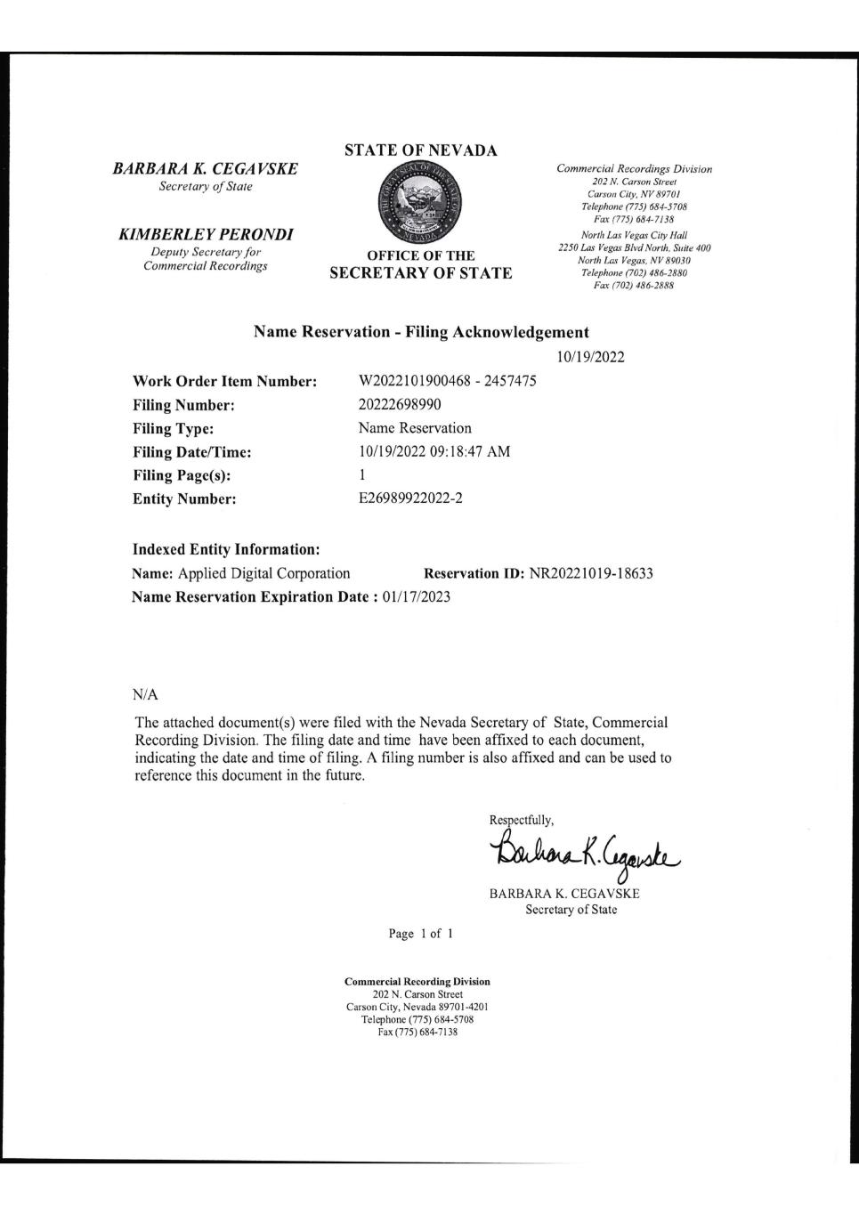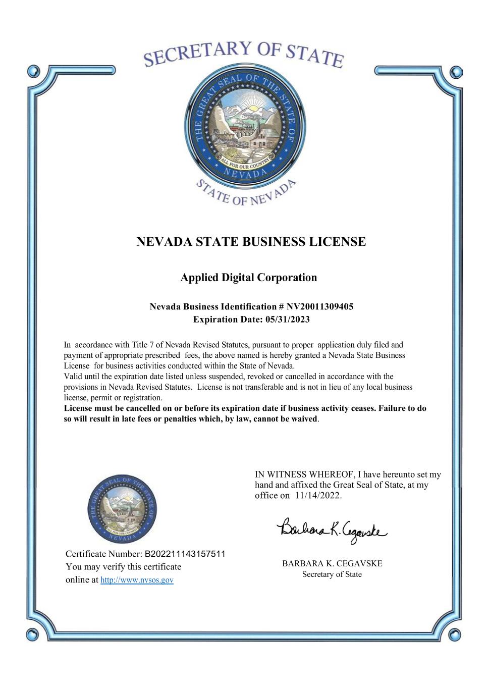 ÒÛÊßÜß ÍÌßÌÛ ÞËÍ×ÒÛÍÍ Ô×ÝÛÒÍÛ ß°°´·»¼ Ü·¹·¬¿´ ݱ®°±®¿¬·±² Ò»ª¿¼¿ Þ«·²» ×¼»²¬·º·½¿¬·±² ýÒÊîððïïíðçìðë Û¨°·®¿¬·±² Ü¿¬»æ ðëñíïñîðîí ײ ¿½½±®¼¿²½» ©·¬¸ Ì·¬´» é ±º Ò»ª¿¼¿ λª·»¼ ͬ¿¬«¬»ô °«®«¿²¬ ¬± °®±°»® ¿°°´·½¿¬·±² ¼«´§ º·´»¼ ¿²¼ °¿§³»²¬ ±º ¿°°®±°®·¿¬» °®»½®·¾»¼ º»»ô ¬¸» ¿¾±ª» ²¿³»¼ · ¸»®»¾§ ¹®¿²¬»¼ ¿ Ò»ª¿¼¿ ͬ¿¬» Þ«·²» Ô·½»²» º±® ¾«·²» ¿½¬·ª·¬·» ½±²¼«½¬»¼ ©·¬¸·² ¬¸» ͬ¿¬» ±º Ò»ª¿¼¿ò Ê¿´·¼ «²¬·´ ¬¸» »¨°·®¿¬·±² ¼¿¬» ´·¬»¼ «²´» «°»²¼»¼ô ®»ª±µ»¼ ±® ½¿²½»´´»¼ ·² ¿½½±®¼¿²½» ©·¬¸ ¬¸» °®±ª··±² ·² Ò»ª¿¼¿ λª·»¼ ͬ¿¬«¬»ò Ô·½»²» · ²±¬ ¬®¿²º»®¿¾´» ¿²¼ · ²±¬ ·² ´·»« ±º ¿²§ ´±½¿´ ¾«·²» ´·½»²»ô °»®³·¬ ±® ®»¹·¬®¿¬·±²ò Ô·½»²» ³«¬ ¾» ½¿²½»´´»¼ ±² ±® ¾»º±®» ·¬ »¨°·®¿¬·±² ¼¿¬» ·º ¾«·²» ¿½¬·ª·¬§ ½»¿»ò Ú¿·´«®» ¬± ¼± ± ©·´´ ®»«´¬ ·² ´¿¬» º»» ±® °»²¿´¬·» ©¸·½¸ô ¾§ ´¿©ô ½¿²²±¬ ¾» ©¿·ª»¼ò Ý»®¬·º·½¿¬» Ò«³¾»®æÞîðîîïïïìíïëéëïï DZ« ³¿§ ª»®·º§ ¬¸· ½»®¬·º·½¿¬» ±²´·²» ¿¬ ¸¬¬°æññ©©©ò²ª±ò¹±ª ×Ò É×ÌÒÛÍÍ ÉØÛÎÛÑÚô × ¸¿ª» ¸»®»«²¬± »¬ ³§ ¸¿²¼ ¿²¼ ¿ºº·¨»¼ ¬¸» Ù®»¿¬ Í»¿´ ±º ͬ¿¬»ô ¿¬ ³§ ±ºº·½» ±²ïïñïìñîðîîò ÞßÎÞßÎß Õò ÝÛÙßÊÍÕÛ Í»½®»¬¿®§ ±º ͬ¿¬»