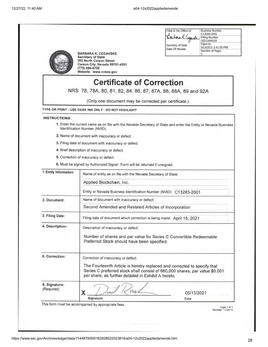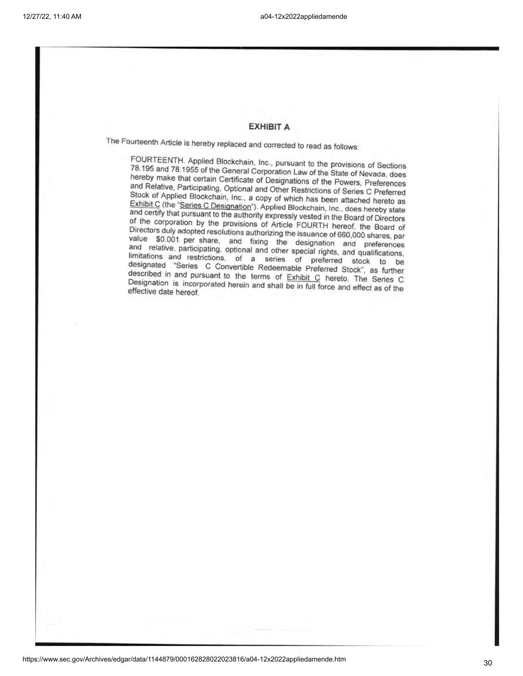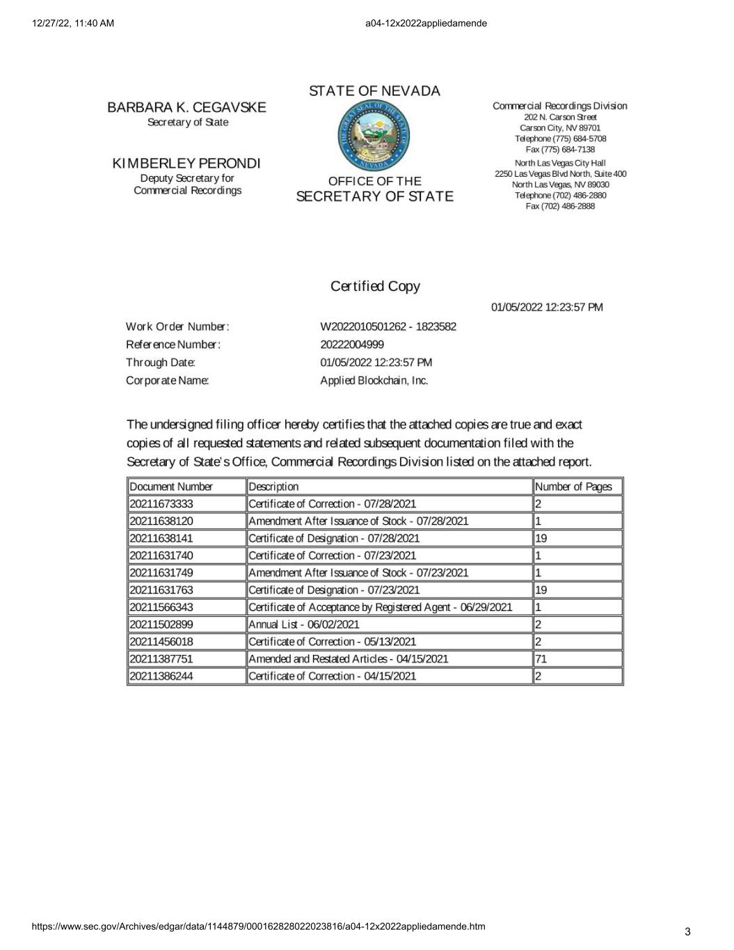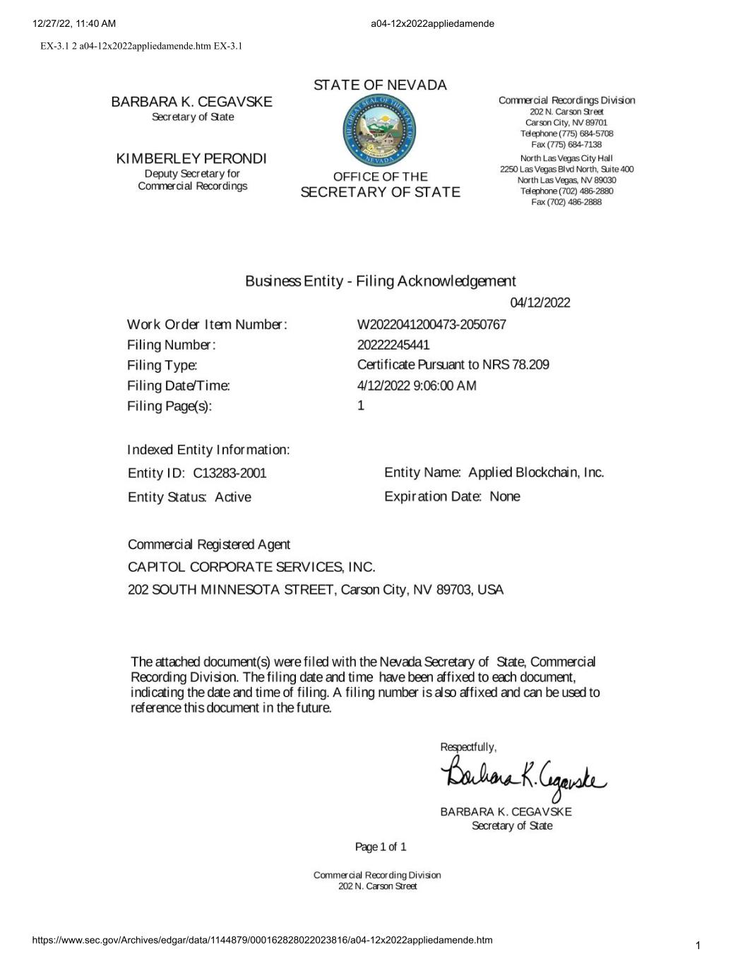12/27/22, 11:40 AM a04-12x2022appliedamende https://www.sec.gov/Archives/edgar/data/1144879/000162828022023816/a04-12x2022appliedamende.htm Certified Copy 01/05/2022 12:23:57 PM Work Order Number: W2022010501262 - 1823582 Reference Number: 20222004999 Through Date: 01/05/2022 12:23:57 PM Corporate Name: Applied Blockchain, Inc. The undersigned filing officer hereby certifies that the attached copies are true and exact copies of all requested statements and related subsequent documentation filed with the Secretary of State’s Office, Commercial Recordings Division listed on the attached report. Document Number Description Number of Pages 20211673333 Certificate of Correction - 07/28/2021 2 20211638120 Amendment After Issuance of Stock - 07/28/2021 1 20211638141 Certificate of Designation - 07/28/2021 19 20211631740 Certificate of Correction - 07/23/2021 1 20211631749 Amendment After Issuance of Stock - 07/23/2021 1 20211631763 Certificate of Designation - 07/23/2021 19 20211566343 Certificate of Acceptance by Registered Agent - 06/29/2021 1 20211502899 Annual List - 06/02/2021 2 20211456018 Certificate of Correction - 05/13/2021 2 20211387751 Amended and Restated Articles - 04/15/2021 71 20211386244 Certificate of Correction - 04/15/2021 2 BARBARA K. CEGAVSKE Secretary of State KIMBERLEY PERONDI Deputy Secretary for Commercial Recordings STATE OF NEVADA OFFICE OF THE SECRETARY OF STATE Commercial Recordings Division 202 N. Carson Street Carson City, NV 89701 Telephone (775) 684-5708 Fax (775) 684-7138 North Las Vegas City Hall 2250 Las Vegas Blvd North, Suite 400 North Las Vegas, NV 89030 Telephone (702) 486-2880 Fax (702) 486-2888 3