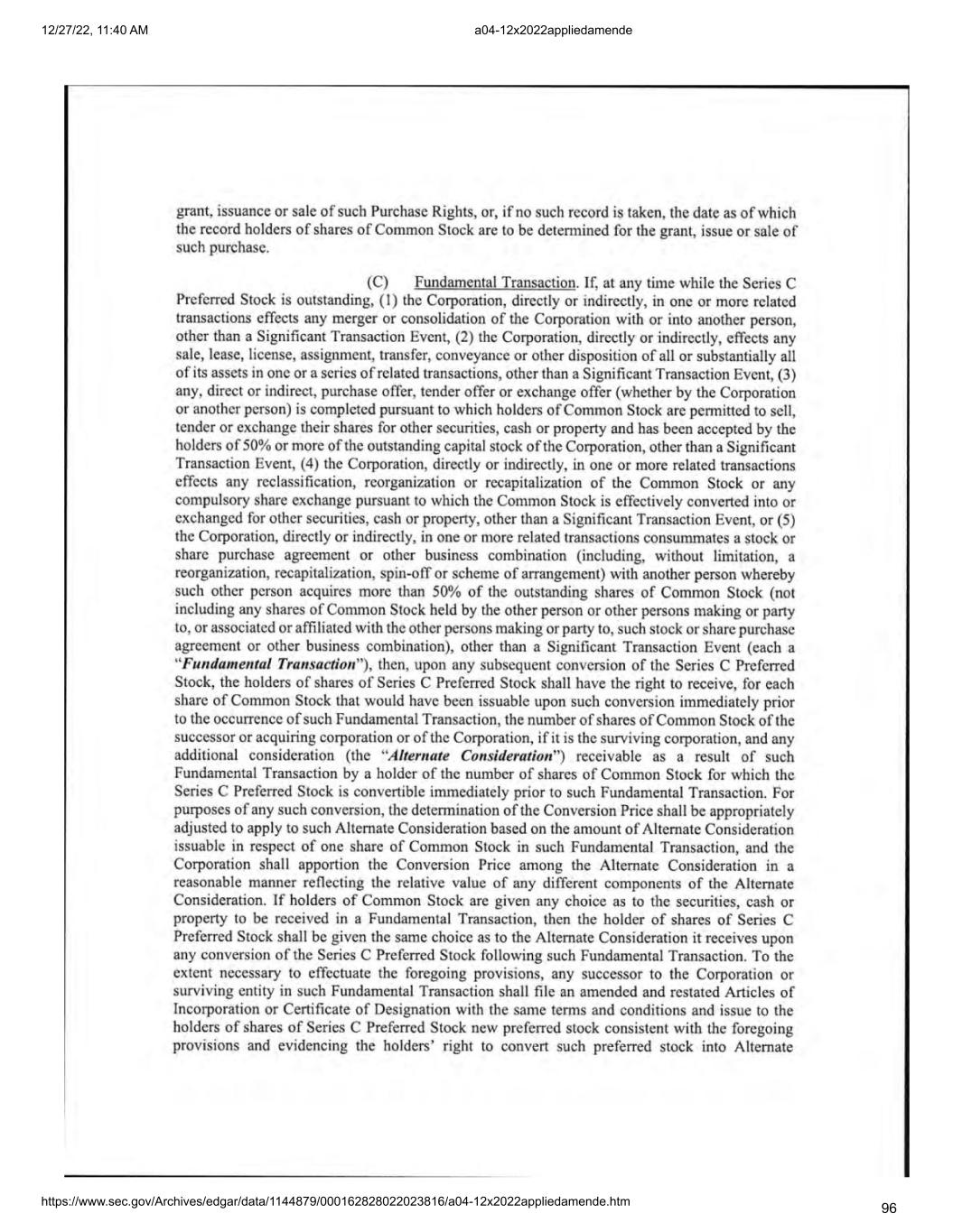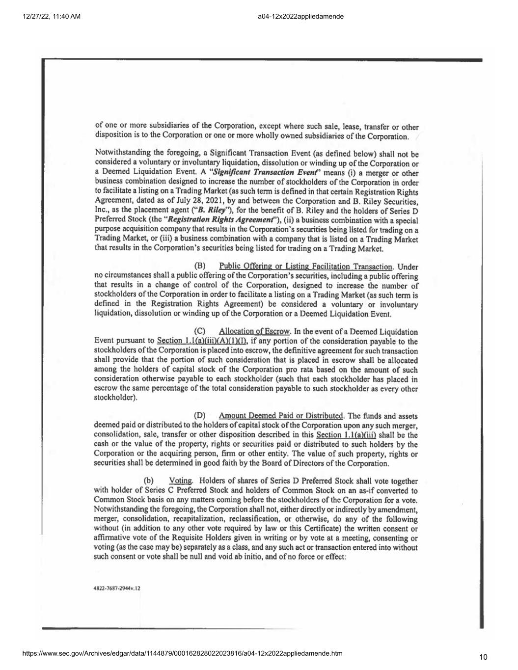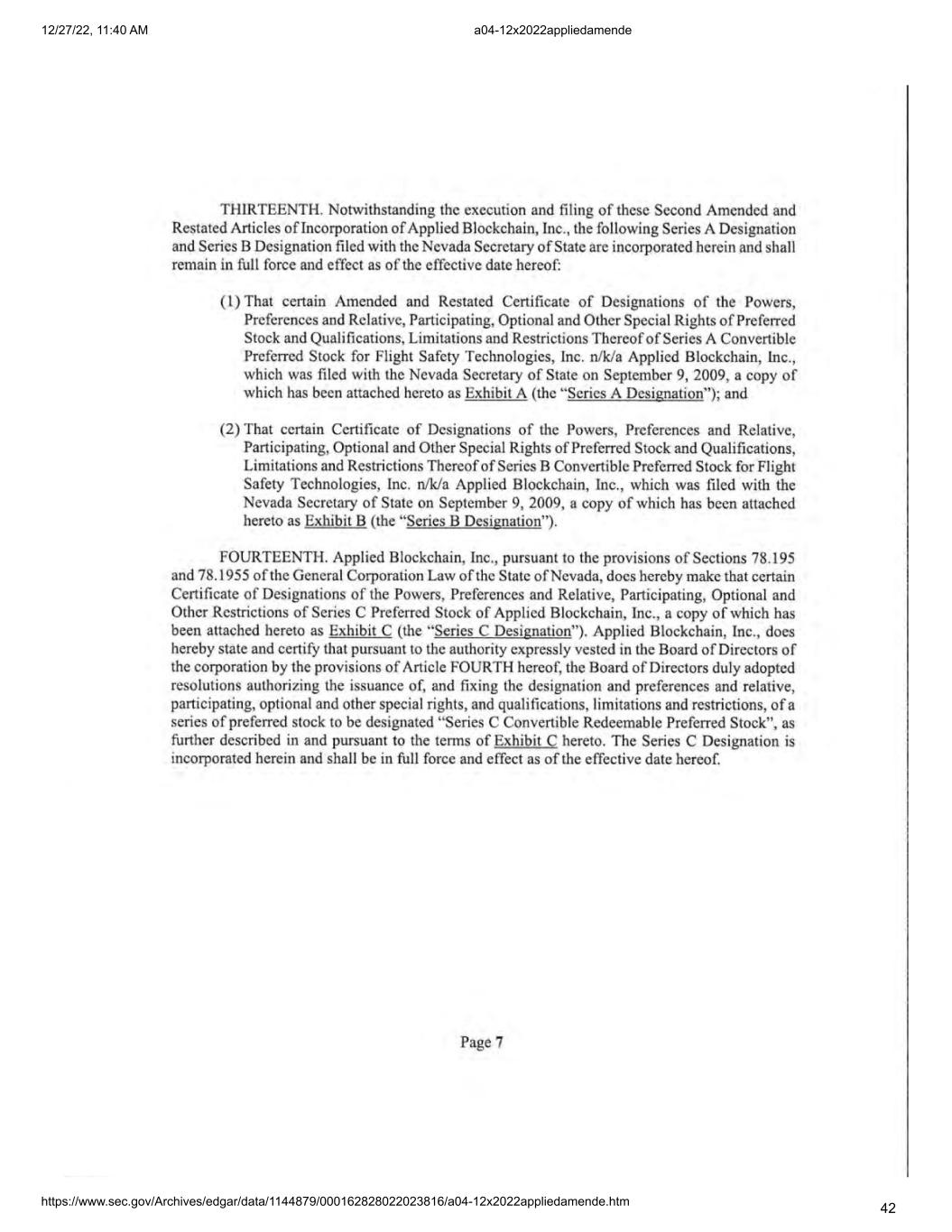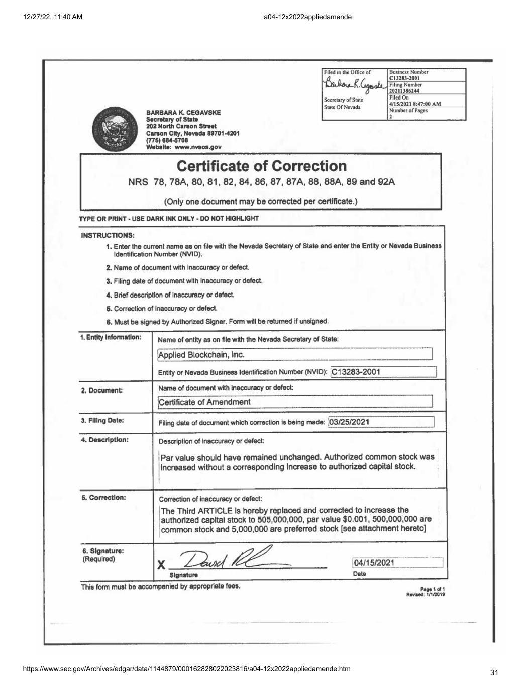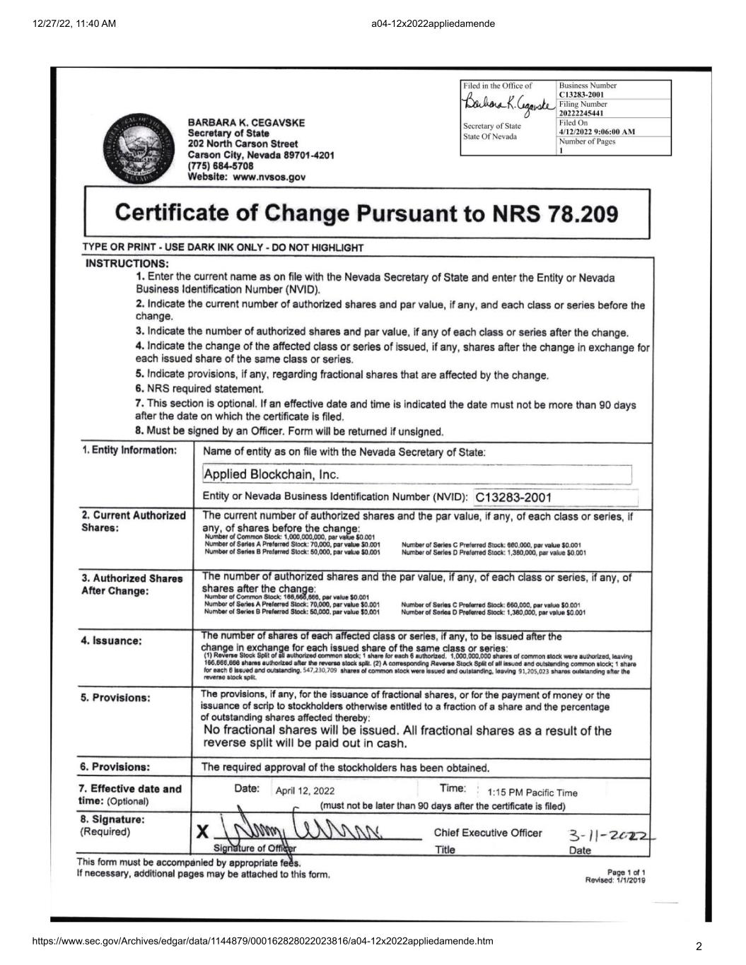 12/27/22, 11:40 AM a04-12x2022appliedamende https://www.sec.gov/Archives/edgar/data/1144879/000162828022023816/a04-12x2022appliedamende.htm Certified Copy 01/05/2022 12:23:57 PM Work Order Number: W2022010501262 - 1823582 Reference Number: 20222004999 Through Date: 01/05/2022 12:23:57 PM Corporate Name: Applied Blockchain, Inc. The undersigned filing officer hereby certifies that the attached copies are true and exact copies of all requested statements and related subsequent documentation filed with the Secretary of State’s Office, Commercial Recordings Division listed on the attached report. Document Number Description Number of Pages 20211673333 Certificate of Correction - 07/28/2021 2 20211638120 Amendment After Issuance of Stock - 07/28/2021 1 20211638141 Certificate of Designation - 07/28/2021 19 20211631740 Certificate of Correction - 07/23/2021 1 20211631749 Amendment After Issuance of Stock - 07/23/2021 1 20211631763 Certificate of Designation - 07/23/2021 19 20211566343 Certificate of Acceptance by Registered Agent - 06/29/2021 1 20211502899 Annual List - 06/02/2021 2 20211456018 Certificate of Correction - 05/13/2021 2 20211387751 Amended and Restated Articles - 04/15/2021 71 20211386244 Certificate of Correction - 04/15/2021 2 BARBARA K. CEGAVSKE Secretary of State KIMBERLEY PERONDI Deputy Secretary for Commercial Recordings STATE OF NEVADA OFFICE OF THE SECRETARY OF STATE Commercial Recordings Division 202 N. Carson Street Carson City, NV 89701 Telephone (775) 684-5708 Fax (775) 684-7138 North Las Vegas City Hall 2250 Las Vegas Blvd North, Suite 400 North Las Vegas, NV 89030 Telephone (702) 486-2880 Fax (702) 486-2888 3
