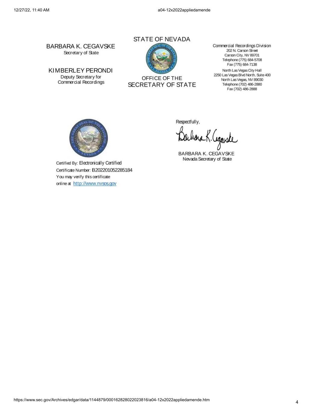 12/27/22, 11:40 AM a04-12x2022appliedamende https://www.sec.gov/Archives/edgar/data/1144879/000162828022023816/a04-12x2022appliedamende.htm Certified By: Electronically Certified Certificate Number: B202201052285184 You may verify this certificate online at http://www.nvsos.gov Respectfully, BARBARA K. CEGAVSKE Nevada Secretary of State BARBARA K. CEGAVSKE Secretary of State KIMBERLEY PERONDI Deputy Secretary for Commercial Recordings STATE OF NEVADA OFFICE OF THE SECRETARY OF STATE Commercial Recordings Division 202 N. Carson Street Carson City, NV 89701 Telephone (775) 684-5708 Fax (775) 684-7138 North Las Vegas City Hall 2250 Las Vegas Blvd North, Suite 400 North Las Vegas, NV 89030 Telephone (702) 486-2880 Fax (702) 486-2888 4
