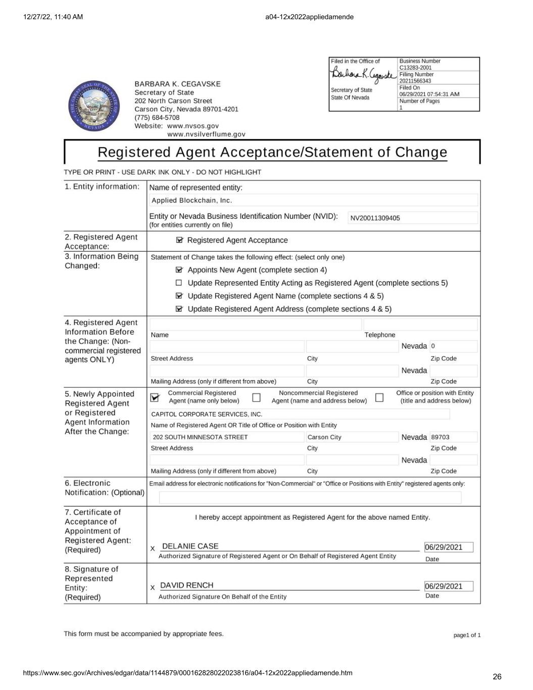12/27/22, 11:40 AM a04-12x2022appliedamende https://www.sec.gov/Archives/edgar/data/1144879/000162828022023816/a04-12x2022appliedamende.htm TYPE OR PRINT - USE DARK INK ONLY - DO NOT HIGHLIGHT 1. Entity information: Name of represented entity: Applied Blockchain, Inc. Entity or Nevada Business Identification Number (NVID): (for entities currently on file) NV20011309405 2. Registered Agent Acceptance: Registered Agent Acceptance 3. Information Being Changed: Statement of Change takes the following effect: (select only one) Appoints New Agent (complete section 4) Update Represented Entity Acting as Registered Agent (complete sections 5) Update Registered Agent Name (complete sections 4 & 5) Update Registered Agent Address (complete sections 4 & 5) 4. Registered Agent Information Before the Change: (Non- commercial registered agents ONLY) Name Telephone Nevada 0 Street Address City Zip Code Nevada Mailing Address (only if different from above) City Zip Code 5. Newly Appointed Registered Agent or Registered Agent Information After the Change: Commercial Registered Agent (name only below) Noncommercial Registered Agent (name and address below) Office or position with Entity (title and address below) CAPITOL CORPORATE SERVICES, INC. Name of Registered Agent OR Title of Office or Position with Entity 202 SOUTH MINNESOTA STREET Carson City Nevada 89703 Street Address City Zip Code Nevada Mailing Address (only if different from above) City Zip Code 6. Electronic Notification: (Optional) Email address for electronic notifications for "Non-Commercial" or "Office or Positions with Entity" registered agents only: 7. Certificate of Acceptance of Appointment of Registered Agent: (Required) I hereby accept appointment as Registered Agent for the above named Entity. X DELANIE CASE Authorized Signature of Registered Agent or On Behalf of Registered Agent Entity Date 06/29/2021 8. Signature of Represented Entity: (Required) X DAVID RENCH Authorized Signature On Behalf of the Entity Date 06/29/2021 BARBARA K. CEGAVSKE Secretary of State 202 North Carson Street Carson City, Nevada 89701-4201 (775) 684-5708 Website: www.nvsos.gov www.nvsilverflume.gov Registered Agent Acceptance/Statement of Change This form must be accompanied by appropriate fees. page1 of 1 Filed in the Office of Secretary of State State Of Nevada Business Number C13283-2001 Filing Number 20211566343 Filed On 06/29/2021 07:54:31 AM Number of Pages 1 26