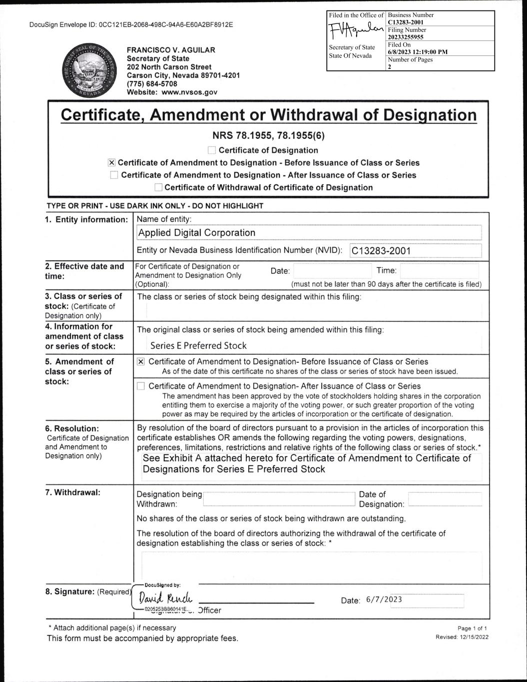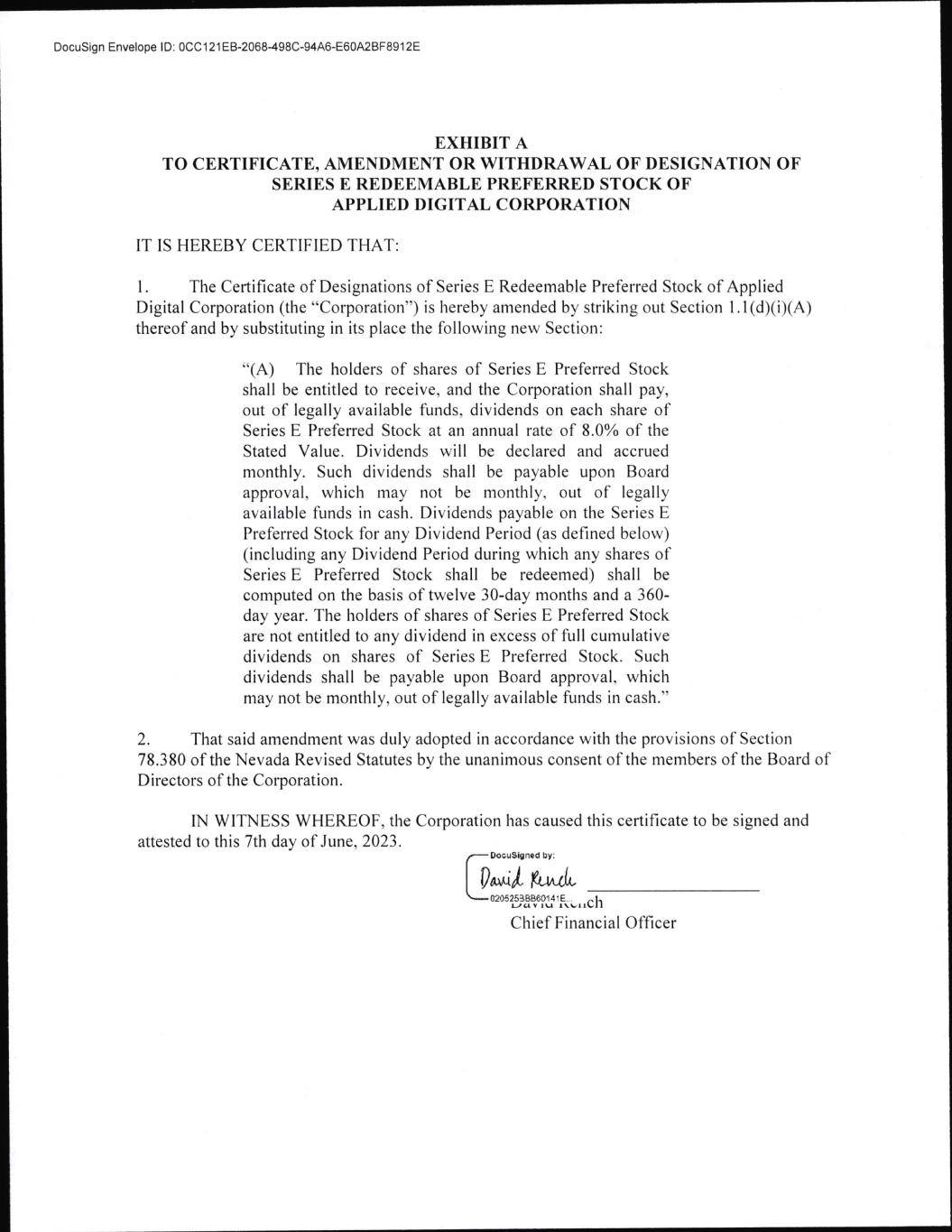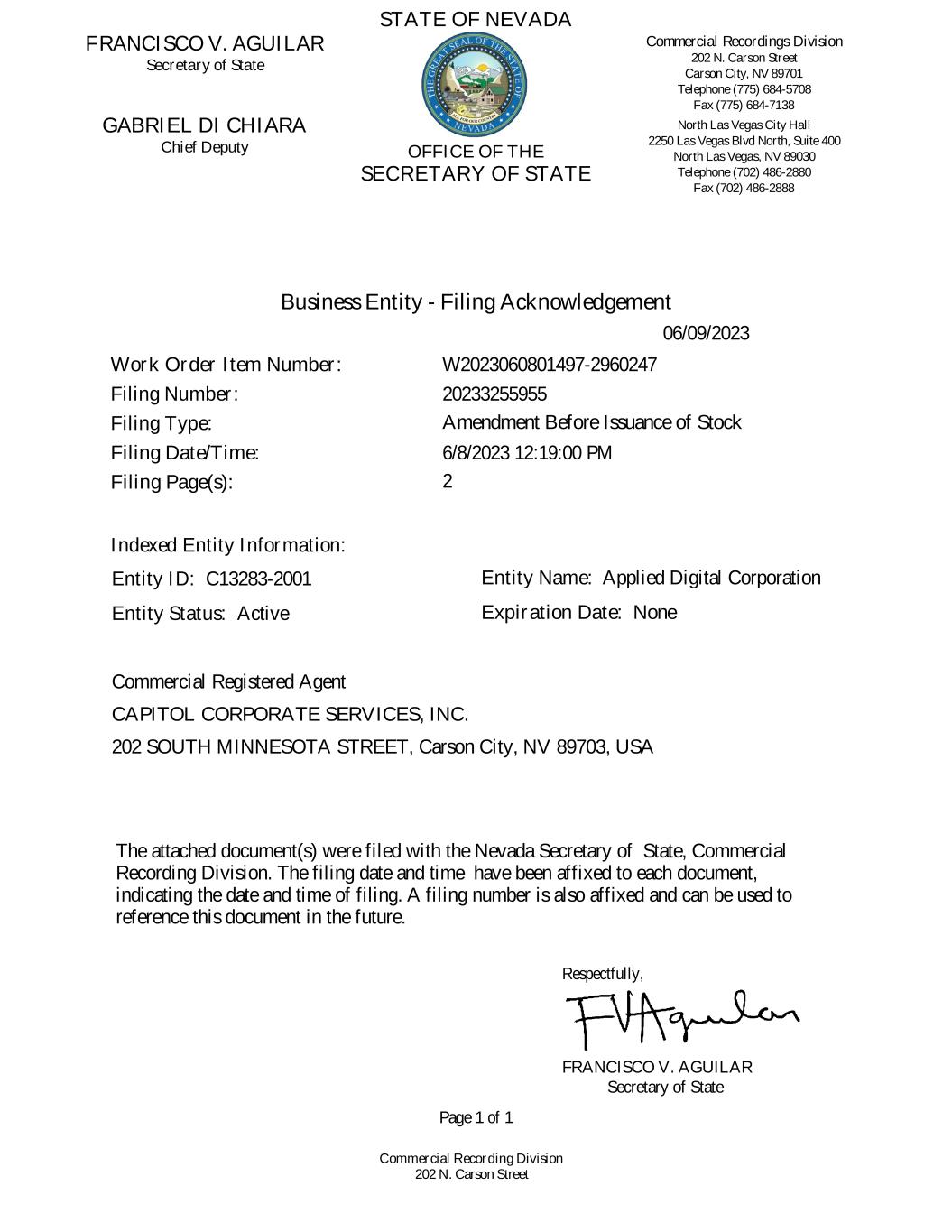 Business Entity - Filing Acknowledgement 06/09/2023 Work Order Item Number: W2023060801497-2960247 Filing Number: 20233255955 Filing Type: Amendment Before Issuance of Stock Filing Date/Time: 6/8/2023 12:19:00 PM Filing Page(s): 2 Indexed Entity Information: Entity ID: C13283-2001 Entity Name: Applied Digital Corporation Entity Status: Active Expiration Date: None Commercial Registered Agent CAPITOL CORPORATE SERVICES, INC. 202 SOUTH MINNESOTA STREET, Carson City, NV 89703, USA FRANCISCO V. AGUILAR Secretary of State GABRIEL DI CHIARA Chief Deputy STATE OF NEVADA OFFICE OF THE SECRETARY OF STATE Commercial Recordings Division 202 N. Carson Street Carson City, NV 89701 Telephone (775) 684-5708 Fax (775) 684-7138 North Las Vegas City Hall 2250 Las Vegas Blvd North, Suite 400 North Las Vegas, NV 89030 Telephone (702) 486-2880 Fax (702) 486-2888 The attached document(s) were filed with the Nevada Secretary of State, Commercial Recording Division. The filing date and time have been affixed to each document, indicating the date and time of filing. A filing number is also affixed and can be used to reference this document in the future. Respectfully, FRANCISCO V. AGUILAR Secretary of State Page 1 of 1 Commercial Recording Division 202 N. Carson Street