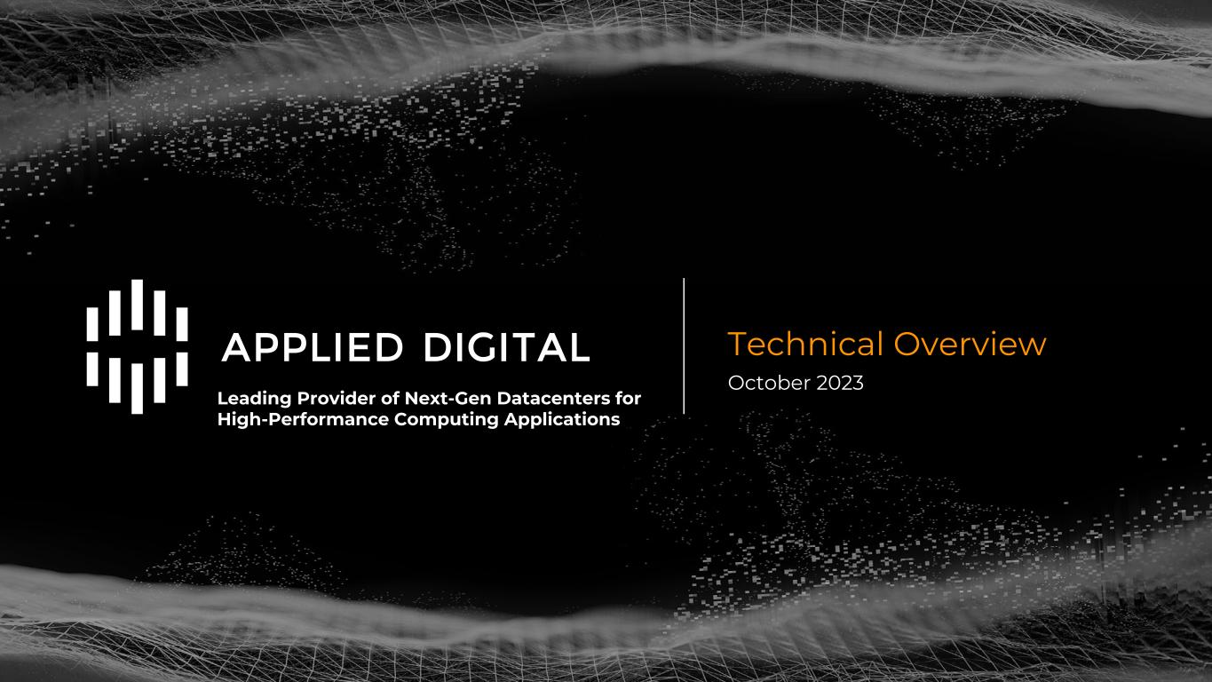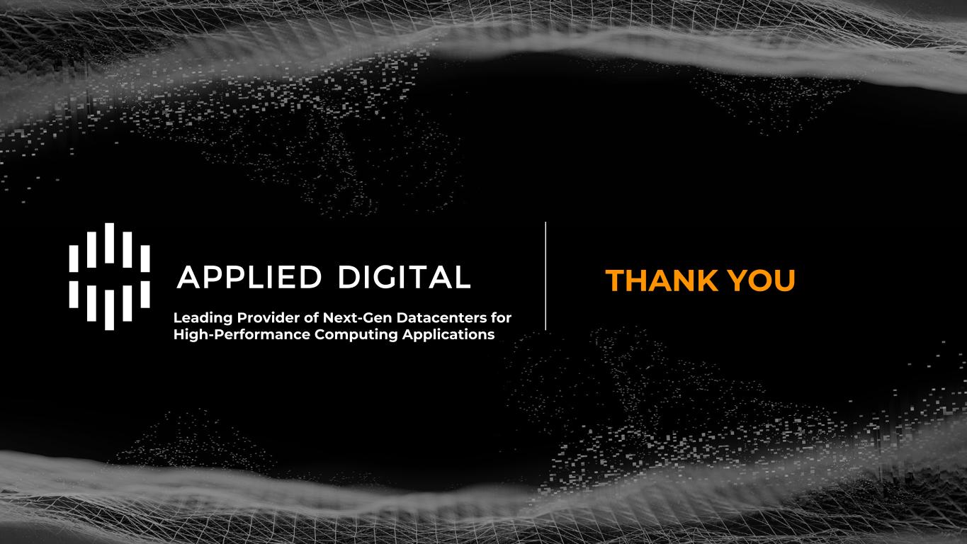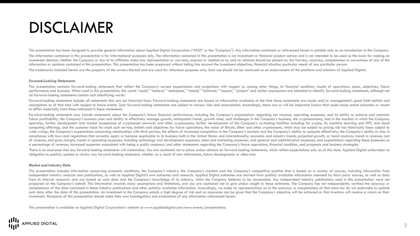 DISCLAIMER This presentation has been designed to provide general information about Applied Digital Corporation (“APLD” or the “Company”). Any information contained or referenced herein is suitable only as an introduction to the Company. The information contained in this presentation is for informational purposes only. The information contained in this presentation is not investment or financial product advice and is not intended to be used as the basis for making an investment decision. Neither the Company or any of its affiliates make any representation or warranty, express or implied as to, and no reliance should be placed on, the fairness, accuracy, completeness or correctness of any of the information or opinions contained in this presentation. This presentation has been prepared without taking into account the investment objectives, financial situation particular needs of any particular person. The trademarks included herein are the property of the owners thereof and are used for reference purposes only. Such use should not be construed as an endorsement of the platform and solutions of Applied Digital. Forward-Looking Statements This presentation contains forward-looking statements that reflect the Company’s current expectations and projections with respect to, among other things, its financial condition, results of operations, plans, objectives, future performance and business. When used in this presentation, the words “could,” “believe,” “anticipate,” “intend,” “estimate,” “expect,” “project” and similar expressions are intended to identify forward-looking statements, although not all forward-looking statements contain such identifying words. Forward-looking statements include all statements that are not historical facts. Forward-looking statements are based on information available at the time those statements are made and/or management’s good faith beliefs and assumptions as of that time with respect to future events. Such forward-looking statements are subject to various risks and uncertainties. Accordingly, there are or will be important factors that could cause actual outcomes or results to differ materially from those indicated in these statements. Forward-looking statements may include statements about the Company’s future financial performance, including the Company’s expectations regarding net revenue, operating expenses, and its ability to achieve and maintain future profitability; the Company’s business plan and ability to effectively manage growth; anticipated trends, growth rates, and challenges in the Company’s business, the cryptoeconomy, and in the markets in which the Company operates; further development and market acceptance of cryptoasset networks and other cryptoassets; further development of the Company’s co-hosting facilities including for crypto, AI, machine learning and HPC and cloud computing offerings, and the customer base for each such service; beliefs and objectives for future operations; the value of Bitcoin, Ether and other cryptoassets, which may be subject to pricing risk has historically been subject to wide swings; the Company’s expectations concerning relationships with third parties; the effects of increased competition in the Company’s markets and the Company’s ability to compete effectively; the Company’s ability to stay in compliance with laws and regulations that currently apply or become applicable to its business both in the United States and internationally; economic and industry trends, projected growth, or trend analysis; trends in revenue, cost of revenue, and gross margin; trends in operating expenses, including technology and development expenses, sales and marketing expenses, and general and administrative expenses, and expectations regarding these expenses as a percentage of revenue; increased expenses associated with being a public company; and other statements regarding the Company’s future operations, financial condition, and prospects and business strategies. There is no assurance that any forward-looking statements will materialize. You are cautioned not to place undue reliance on forward-looking statements, which reflect expectations only as of this date. Applied Digital undertakes no obligation to publicly update or review any forward-looking statement, whether as a result of new information, future developments or otherwise. Market and Industry Data This presentation includes information concerning economic conditions, the Company’s industry, the Company’s markets and the Company’s competitive position that is based on a variety of sources, including information from independent industry analysts and publications, as well as Applied Digital’s own estimates and research. Applied Digital estimates are derived from publicly available information released by third party sources, as well as data from its internal research, and are based on such data and the Company’s knowledge of its industry, which the Company believes to be reasonable. Any independent industry publications used in this presentation were not prepared on the Company’s behalf. This information involves many assumptions and limitations, and you are cautioned not to give undue weight to these estimates. The Company has not independently verified the accuracy or completeness of the data contained in these industry publications and other publicly available information. Accordingly, we make no representations as to the accuracy or completeness of that data nor do we undertake to update such data after the date of this presentation. An investment in the Company entails a high degree of risk and no assurance can be given that the Company’s objective will be achieved or that investors will receive a return on their investment. Recipients of this presentation should make their own investigations and evaluations of any information referenced herein. This presentation is available on Applied Digit