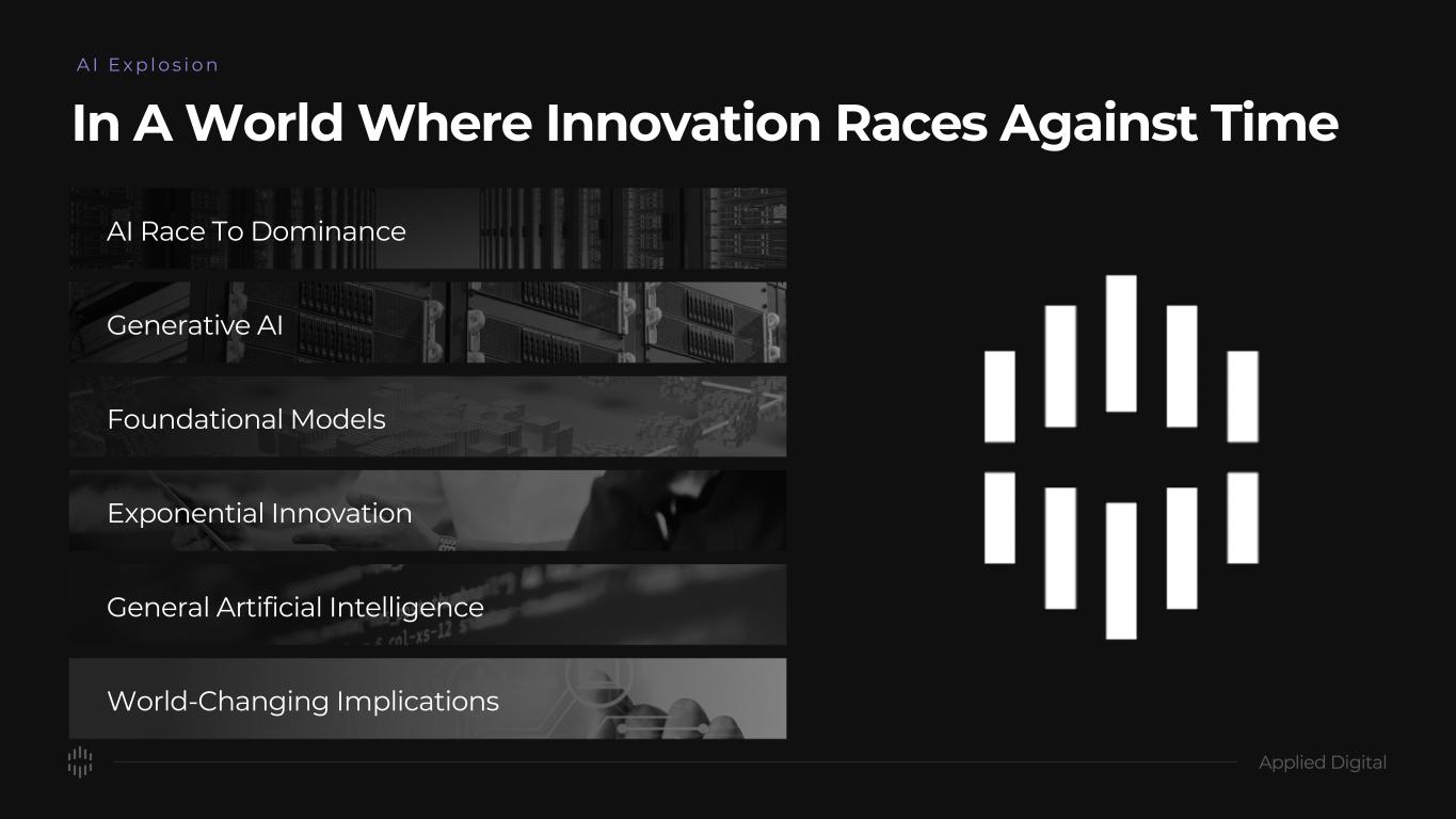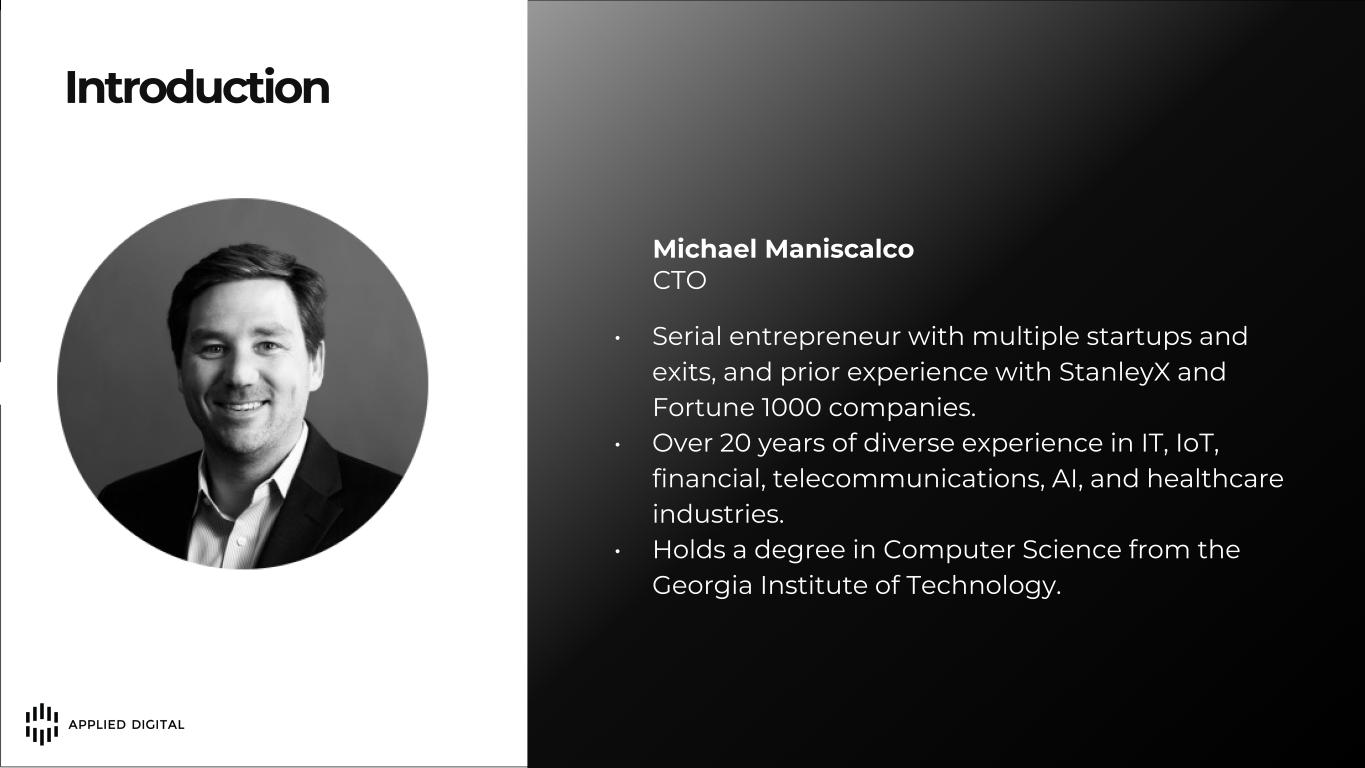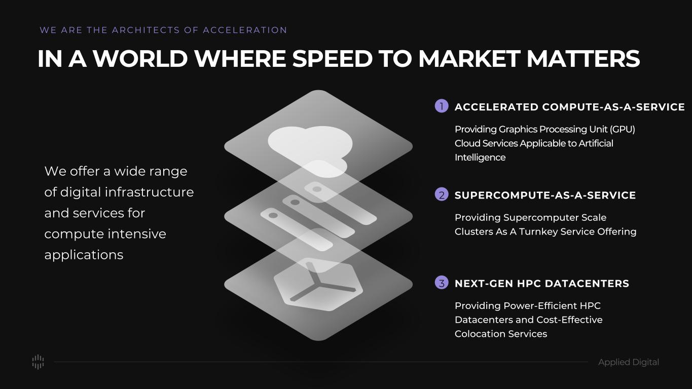 DISCLAIMER This presentation has been designed to provide general information about Applied Digital Corporation (“APLD” or the “Company”). Any information contained or referenced herein is suitable only as an introduction to the Company. The information contained in this presentation is for informational purposes only. The information contained in this presentation is not investment or financial product advice and is not intended to be used as the basis for making an investment decision. Neither the Company or any of its affiliates make any representation or warranty, express or implied as to, and no reliance should be placed on, the fairness, accuracy, completeness or correctness of any of the information or opinions contained in this presentation. This presentation has been prepared without taking into account the investment objectives, financial situation particular needs of any particular person. The trademarks included herein are the property of the owners thereof and are used for reference purposes only. Such use should not be construed as an endorsement of the platform and solutions of Applied Digital. Forward-Looking Statements This presentation contains forward-looking statements that reflect the Company’s current expectations and projections with respect to, among other things, its financial condition, results of operations, plans, objectives, future performance and business. When used in this presentation, the words “could,” “believe,” “anticipate,” “intend,” “estimate,” “expect,” “project” and similar expressions are intended to identify forward-looking statements, although not all forward-looking statements contain such identifying words. Forward-looking statements include all statements that are not historical facts. Forward-looking statements are based on information available at the time those statements are made and/or management’s good faith beliefs and assumptions as of that time with respect to future events. Such forward-looking statements are subject to various risks and uncertainties. Accordingly, there are or will be important factors that could cause actual outcomes or results to differ materially from those indicated in these statements. Forward-looking statements may include statements about the Company’s future financial performance, including the Company’s expectations regarding net revenue, operating expenses, and its ability to achieve and maintain future profitability; the Company’s business plan and ability to effectively manage growth; anticipated trends, growth rates, and challenges in the Company’s business, the cryptoeconomy, and in the markets in which the Company operates; further development and market acceptance of cryptoasset networks and other cryptoassets; further development of the Company’s co-hosting facilities including for crypto, AI, machine learning and HPC and cloud computing offerings, and the customer base for each such service; beliefs and objectives for future operations; the value of Bitcoin, Ether and other cryptoassets, which may be subject to pricing risk has historically been subject to wide swings; the Company’s expectations concerning relationships with third parties; the effects of increased competition in the Company’s markets and the Company’s ability to compete effectively; the Company’s ability to stay in compliance with laws and regulations that currently apply or become applicable to its business both in the United States and internationally; economic and industry trends, projected growth, or trend analysis; trends in revenue, cost of revenue, and gross margin; trends in operating expenses, including technology and development expenses, sales and marketing expenses, and general and administrative expenses, and expectations regarding these expenses as a percentage of revenue; increased expenses associated with being a public company; and other statements regarding the Company’s future operations, financial condition, and prospects and business strategies. There is no assurance that any forward-looking statements will materialize. You are cautioned not to place undue reliance on forward-looking statements, which reflect expectations only as of this date. Applied Digital undertakes no obligation to publicly update or review any forward-looking statement, whether as a result of new information, future developments or otherwise. Market and Industry Data This presentation includes information concerning economic conditions, the Company’s industry, the Company’s markets and the Company’s competitive position that is based on a variety of sources, including information from independent industry analysts and publications, as well as Applied Digital’s own estimates and research. Applied Digital estimates are derived from publicly available information released by third party sources, as well as data from its internal research, and are based on such data and the Company’s knowledge of its industry, which the Company believes to be reasonable. Any independent industry publications used in this presentation were not prepared on the Company’s behalf. This information involves many assumptions and limitations, and you are cautioned not to give undue weight to these estimates. The Company has not independently verified the accuracy or completeness of the data contained in these industry publications and other publicly available information. Accordingly, we make no representations as to the accuracy or completeness of that data nor do we undertake to update such data after the date of this presentation. An investment in the Company entails a high degree of risk and no assurance can be given that the Company’s objective will be achieved or that investors will receive a return on their investment. Recipients of this presentation should make their own investigations and evaluations of any information referenced herein. This presentation is available on Applied Digit