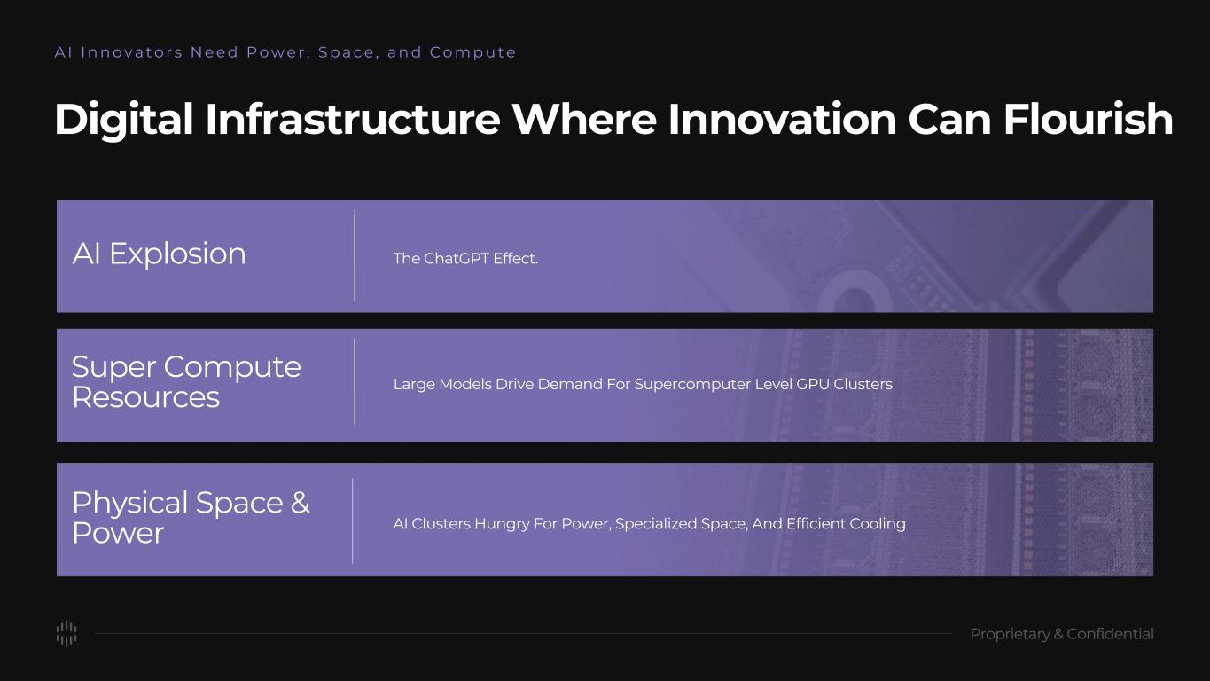 Super Compute Resources Large Models Drive Demand For Supercomputer Level GPU Clusters AI Explosion The ChatGPT Effect. Digital Infrastructure Where Innovation Can Flourish Physical Space & Power AI Clusters Hungry For Power, Specialized Space, And Efficient Cooling A I I n n o v a t o r s N e e d P o w e r , S p a c e , a n d C o m p u t e
