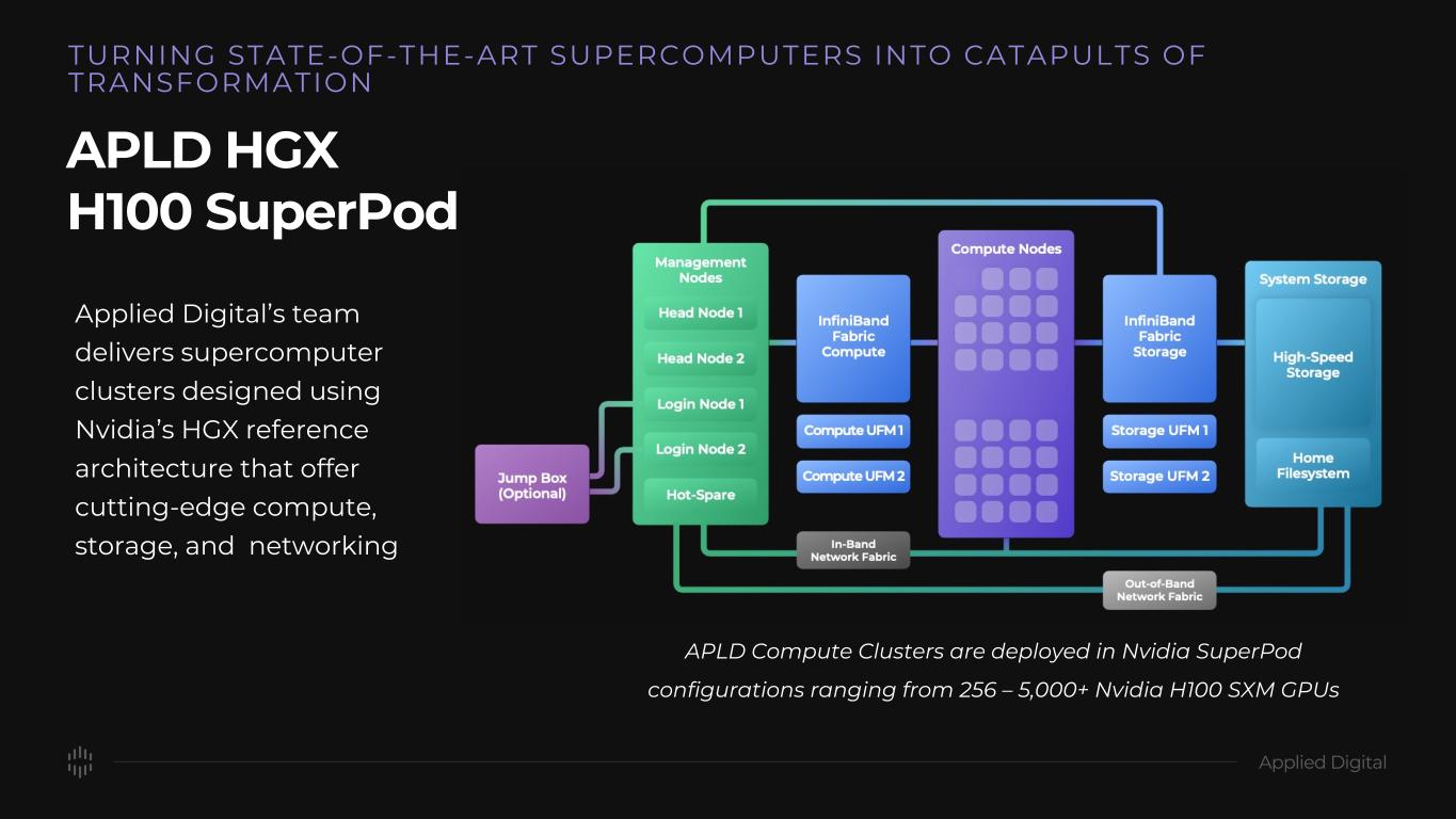 APLD HGX H100 SuperPod Applied Digital’s team delivers supercomputer clusters designed using Nvidia’s HGX reference architecture that offer cutting-edge compute, storage, and networking TURNING STATE-OF-THE-ART SUPERCOMPUTERS INTO CATAPULTS OF TRANSFORMATION APLD Compute Clusters are deployed in Nvidia SuperPod configurations ranging from 256 – 5,000+ Nvidia H100 SXM GPUs