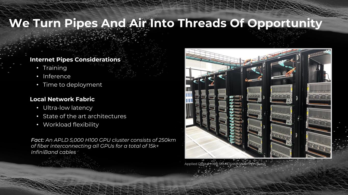 We Turn Pipes And Air Into Threads Of Opportunity Internet Pipes Considerations • Training • Inference • Time to deployment Local Network Fabric • Ultra-low latency • State of the art architectures • Workload flexibility Fact: An APLD 5,000 H100 GPU cluster consists of 250km of fiber interconnecting all GPUs for a total of 15k+ InfiniBand cables Applied Digital H100 SXM Cluster With InfiniBand
