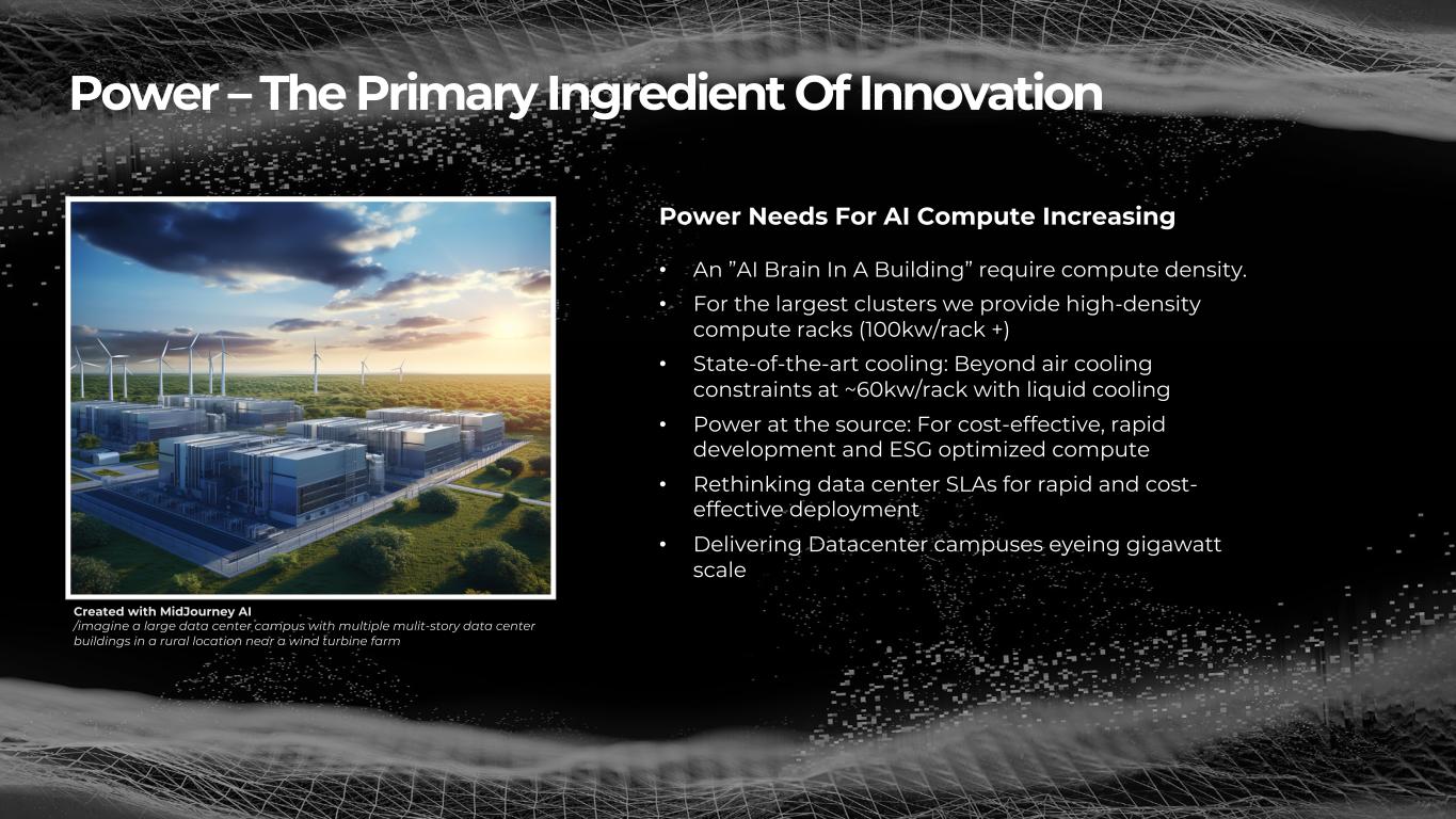 Power – The Primary Ingredient Of Innovation Created with MidJourney AI /imagine a large data center campus with multiple mulit-story data center buildings in a rural location near a wind turbine farm Power Needs For AI Compute Increasing • An ”AI Brain In A Building” require compute density. • For the largest clusters we provide high-density compute racks (100kw/rack +) • State-of-the-art cooling: Beyond air cooling constraints at ~60kw/rack with liquid cooling • Power at the source: For cost-effective, rapid development and ESG optimized compute • Rethinking data center SLAs for rapid and cost- effective deployment • Delivering Datacenter campuses eyeing gigawatt scale