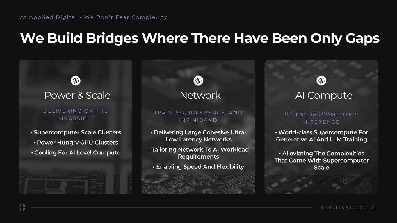 Power & Scale D E L I V E R I N G O N T H E I M P O S S I B L E • Supercomputer Scale Clusters • Power Hungry GPU Clusters • Cooling For AI Level Compute Network T R A I N I N G , I N F E R E N C E , A N D I N F I N I B A N D • Delivering Large Cohesive Ultra- low Latency Networks • Tailoring Network To AI Workload Requirements • Enabling Speed And Flexibility AI Compute G P U S U P E R C O M P U T E & I N F E R E N C E • World-class Supercompute For Generative AI And LLM Training • Alleviating The Complexities That Come With Supercomputer Scale A t A p p l i e d D i g i t a l - W e D o n ’ t F e a r C o m p l e x i t y We Build Bridges Where There Have Been Only Gaps