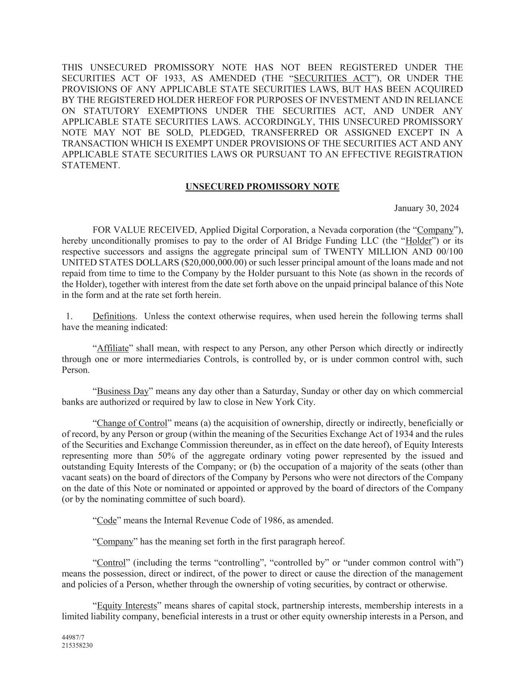 44987/7 215358230 THIS UNSECURED PROMISSORY NOTE HAS NOT BEEN REGISTERED UNDER THE SECURITIES ACT OF 1933, AS AMENDED (THE “SECURITIES ACT”), OR UNDER THE PROVISIONS OF ANY APPLICABLE STATE SECURITIES LAWS, BUT HAS BEEN ACQUIRED BY THE REGISTERED HOLDER HEREOF FOR PURPOSES OF INVESTMENT AND IN RELIANCE ON STATUTORY EXEMPTIONS UNDER THE SECURITIES ACT, AND UNDER ANY APPLICABLE STATE SECURITIES LAWS. ACCORDINGLY, THIS UNSECURED PROMISSORY NOTE MAY NOT BE SOLD, PLEDGED, TRANSFERRED OR ASSIGNED EXCEPT IN A TRANSACTION WHICH IS EXEMPT UNDER PROVISIONS OF THE SECURITIES ACT AND ANY APPLICABLE STATE SECURITIES LAWS OR PURSUANT TO AN EFFECTIVE REGISTRATION STATEMENT. UNSECURED PROMISSORY NOTE January 30, 2024 FOR VALUE RECEIVED, Applied Digital Corporation, a Nevada corporation (the “Company”), hereby unconditionally promises to pay to the order of AI Bridge Funding LLC (the “Holder”) or its respective successors and assigns the aggregate principal sum of TWENTY MILLION AND 00/100 UNITED STATES DOLLARS ($20,000,000.00) or such lesser principal amount of the loans made and not repaid from time to time to the Company by the Holder pursuant to this Note (as shown in the records of the Holder), together with interest from the date set forth above on the unpaid principal balance of this Note in the form and at the rate set forth herein. 1. Definitions. Unless the context otherwise requires, when used herein the following terms shall have the meaning indicated: “Affiliate” shall mean, with respect to any Person, any other Person which directly or indirectly through one or more intermediaries Controls, is controlled by, or is under common control with, such Person. “Business Day” means any day other than a Saturday, Sunday or other day on which commercial banks are authorized or required by law to close in New York City. “Change of Control” means (a) the acquisition of ownership, directly or indirectly, beneficially or of record, by any Person or group (within the meaning of the Securities Exchange Act of 1934 and the rules of the Securities and Exchange Commission thereunder, as in effect on the date hereof), of Equity Interests representing more than 50% of the aggregate ordinary voting power represented by the issued and outstanding Equity Interests of the Company; or (b) the occupation of a majority of the seats (other than vacant seats) on the board of directors of the Company by Persons who were not directors of the Company on the date of this Note or nominated or appointed or approved by the board of directors of the Company (or by the nominating committee of such board). “Code” means the Internal Revenue Code of 1986, as amended. “Company” has the meaning set forth in the first paragraph hereof. “Control” (including the terms “controlling”, “controlled by” or “under common control with”) means the possession, direct or indirect, of the power to direct or cause the direction of the management and policies of a Person, whether through the ownership of voting securities, by contract or otherwise. “Equity Interests” means shares of capital stock, partnership interests, membership interests in a limited liability company, beneficial interests in a trust or other equity ownership interests in a Person, and