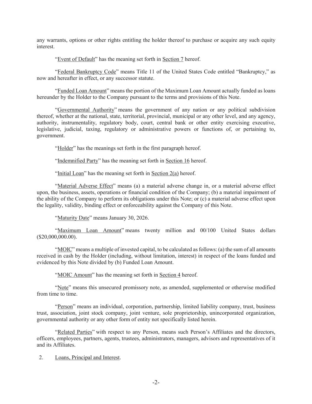 -2- any warrants, options or other rights entitling the holder thereof to purchase or acquire any such equity interest. “Event of Default” has the meaning set forth in Section 7 hereof. “Federal Bankruptcy Code” means Title 11 of the United States Code entitled “Bankruptcy,” as now and hereafter in effect, or any successor statute. “Funded Loan Amount” means the portion of the Maximum Loan Amount actually funded as loans hereunder by the Holder to the Company pursuant to the terms and provisions of this Note. “Governmental Authority” means the government of any nation or any political subdivision thereof, whether at the national, state, territorial, provincial, municipal or any other level, and any agency, authority, instrumentality, regulatory body, court, central bank or other entity exercising executive, legislative, judicial, taxing, regulatory or administrative powers or functions of, or pertaining to, government. “Holder” has the meanings set forth in the first paragraph hereof. “Indemnified Party” has the meaning set forth in Section 16 hereof. “Initial Loan” has the meaning set forth in Section 2(a) hereof. “Material Adverse Effect” means (a) a material adverse change in, or a material adverse effect upon, the business, assets, operations or financial condition of the Company; (b) a material impairment of the ability of the Company to perform its obligations under this Note; or (c) a material adverse effect upon the legality, validity, binding effect or enforceability against the Company of this Note. “Maturity Date” means January 30, 2026. “Maximum Loan Amount” means twenty million and 00/100 United States dollars ($20,000,000.00). “MOIC” means a multiple of invested capital, to be calculated as follows: (a) the sum of all amounts received in cash by the Holder (including, without limitation, interest) in respect of the loans funded and evidenced by this Note divided by (b) Funded Loan Amount. “MOIC Amount” has the meaning set forth in Section 4 hereof. “Note” means this unsecured promissory note, as amended, supplemented or otherwise modified from time to time. “Person” means an individual, corporation, partnership, limited liability company, trust, business trust, association, joint stock company, joint venture, sole proprietorship, unincorporated organization, governmental authority or any other form of entity not specifically listed herein. “Related Parties” with respect to any Person, means such Person’s Affiliates and the directors, officers, employees, partners, agents, trustees, administrators, managers, advisors and representatives of it and its Affiliates. 2. Loans, Principal and Interest.