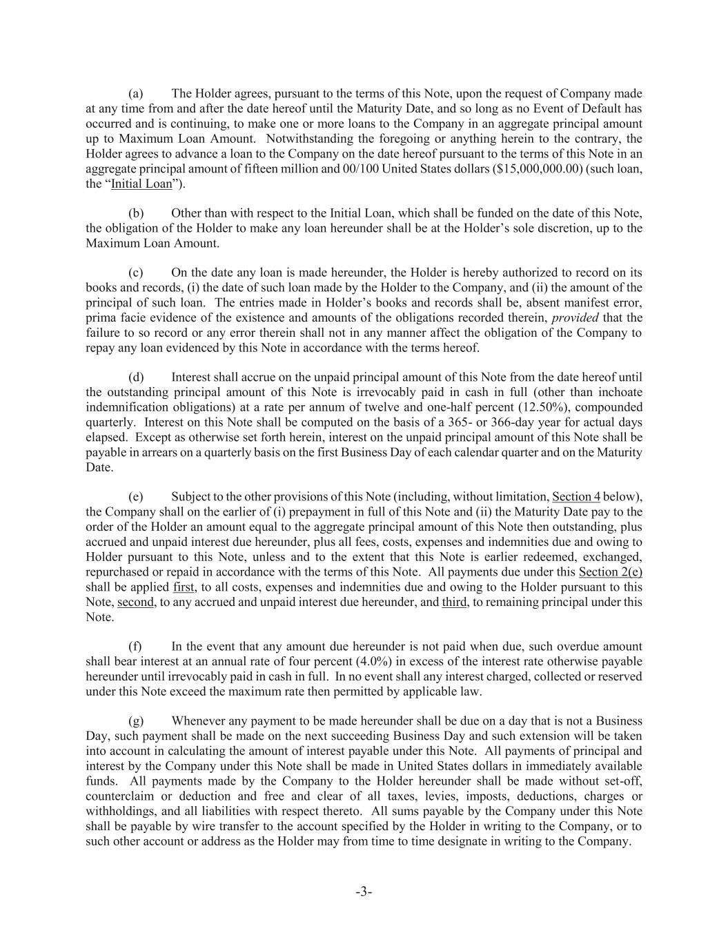 -3- (a) The Holder agrees, pursuant to the terms of this Note, upon the request of Company made at any time from and after the date hereof until the Maturity Date, and so long as no Event of Default has occurred and is continuing, to make one or more loans to the Company in an aggregate principal amount up to Maximum Loan Amount. Notwithstanding the foregoing or anything herein to the contrary, the Holder agrees to advance a loan to the Company on the date hereof pursuant to the terms of this Note in an aggregate principal amount of fifteen million and 00/100 United States dollars ($15,000,000.00) (such loan, the “Initial Loan”). (b) Other than with respect to the Initial Loan, which shall be funded on the date of this Note, the obligation of the Holder to make any loan hereunder shall be at the Holder’s sole discretion, up to the Maximum Loan Amount. (c) On the date any loan is made hereunder, the Holder is hereby authorized to record on its books and records, (i) the date of such loan made by the Holder to the Company, and (ii) the amount of the principal of such loan. The entries made in Holder’s books and records shall be, absent manifest error, prima facie evidence of the existence and amounts of the obligations recorded therein, provided that the failure to so record or any error therein shall not in any manner affect the obligation of the Company to repay any loan evidenced by this Note in accordance with the terms hereof. (d) Interest shall accrue on the unpaid principal amount of this Note from the date hereof until the outstanding principal amount of this Note is irrevocably paid in cash in full (other than inchoate indemnification obligations) at a rate per annum of twelve and one-half percent (12.50%), compounded quarterly. Interest on this Note shall be computed on the basis of a 365- or 366-day year for actual days elapsed. Except as otherwise set forth herein, interest on the unpaid principal amount of this Note shall be payable in arrears on a quarterly basis on the first Business Day of each calendar quarter and on the Maturity Date. (e) Subject to the other provisions of this Note (including, without limitation, Section 4 below), the Company shall on the earlier of (i) prepayment in full of this Note and (ii) the Maturity Date pay to the order of the Holder an amount equal to the aggregate principal amount of this Note then outstanding, plus accrued and unpaid interest due hereunder, plus all fees, costs, expenses and indemnities due and owing to Holder pursuant to this Note, unless and to the extent that this Note is earlier redeemed, exchanged, repurchased or repaid in accordance with the terms of this Note. All payments due under this Section 2(e) shall be applied first, to all costs, expenses and indemnities due and owing to the Holder pursuant to this Note, second, to any accrued and unpaid interest due hereunder, and third, to remaining principal under this Note. (f) In the event that any amount due hereunder is not paid when due, such overdue amount shall bear interest at an annual rate of four percent (4.0%) in excess of the interest rate otherwise payable hereunder until irrevocably paid in cash in full. In no event shall any interest charged, collected or reserved under this Note exceed the maximum rate then permitted by applicable law. (g) Whenever any payment to be made hereunder shall be due on a day that is not a Business Day, such payment shall be made on the next succeeding Business Day and such extension will be taken into account in calculating the amount of interest payable under this Note. All payments of principal and interest by the Company under this Note shall be made in United States dollars in immediately available funds. All payments made by the Company to the Holder hereunder shall be made without set-off, counterclaim or deduction and free and clear of all taxes, levies, imposts, deductions, charges or withholdings, and all liabilities with respect thereto. All sums payable by the Company under this Note shall be payable by wire transfer to the account specified by the Holder in writing to the Company, or to such other account or address as the Holder may from time to time designate in writing to the Company.