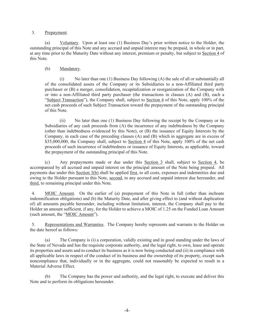 -4- 3. Prepayment. (a) Voluntary. Upon at least one (1) Business Day’s prior written notice to the Holder, the outstanding principal of this Note and any accrued and unpaid interest may be prepaid, in whole or in part, at any time prior to the Maturity Date without any interest, premium or penalty, but subject to Section 4 of this Note. (b) Mandatory. (i) No later than one (1) Business Day following (A) the sale of all or substantially all of the consolidated assets of the Company or its Subsidiaries to a non-Affiliated third party purchaser or (B) a merger, consolidation, recapitalization or reorganization of the Company with or into a non-Affiliated third party purchaser (the transactions in clauses (A) and (B), each a “Subject Transaction”), the Company shall, subject to Section 4 of this Note, apply 100% of the net cash proceeds of such Subject Transaction toward the prepayment of the outstanding principal of this Note. (ii) No later than one (1) Business Day following the receipt by the Company or its Subsidiaries of any cash proceeds from (A) the incurrence of any indebtedness by the Company (other than indebtedness evidenced by this Note), or (B) the issuance of Equity Interests by the Company, in each case of the preceding clauses (A) and (B) which in aggregate are in excess of $35,000,000, the Company shall, subject to Section 4 of this Note, apply 100% of the net cash proceeds of such incurrence of indebtedness or issuance of Equity Interests, as applicable, toward the prepayment of the outstanding principal of this Note. (c) Any prepayments made or due under this Section 3 shall, subject to Section 4, be accompanied by all accrued and unpaid interest on the principal amount of the Note being prepaid. All payments due under this Section 3(b) shall be applied first, to all costs, expenses and indemnities due and owing to the Holder pursuant to this Note, second, to any accrued and unpaid interest due hereunder, and third, to remaining principal under this Note. 4. MOIC Amount. On the earlier of (a) prepayment of this Note in full (other than inchoate indemnification obligations) and (b) the Maturity Date, and after giving effect to (and without duplication of) all amounts payable hereunder, including without limitation, interest, the Company shall pay to the Holder an amount sufficient, if any, for the Holder to achieve a MOIC of 1.25 on the Funded Loan Amount (such amount, the “MOIC Amount”). 5. Representations and Warranties. The Company hereby represents and warrants to the Holder on the date hereof as follows: (a) The Company is (i) a corporation, validly existing and in good standing under the laws of the State of Nevada and has the requisite corporate authority, and the legal right, to own, lease and operate its properties and assets and to conduct its business as it is now being conducted and (ii) in compliance with all applicable laws in respect of the conduct of its business and the ownership of its property, except such noncompliance that, individually or in the aggregate, could not reasonably be expected to result in a Material Adverse Effect. (b) The Company has the power and authority, and the legal right, to execute and deliver this Note and to perform its obligations hereunder.