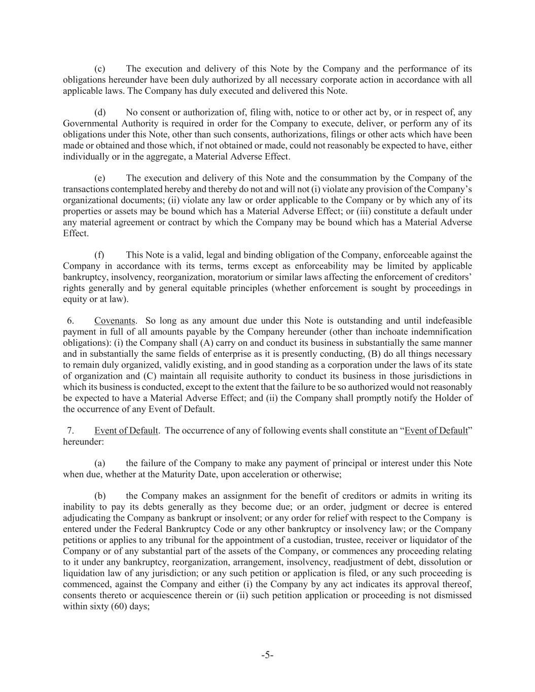 -5- (c) The execution and delivery of this Note by the Company and the performance of its obligations hereunder have been duly authorized by all necessary corporate action in accordance with all applicable laws. The Company has duly executed and delivered this Note. (d) No consent or authorization of, filing with, notice to or other act by, or in respect of, any Governmental Authority is required in order for the Company to execute, deliver, or perform any of its obligations under this Note, other than such consents, authorizations, filings or other acts which have been made or obtained and those which, if not obtained or made, could not reasonably be expected to have, either individually or in the aggregate, a Material Adverse Effect. (e) The execution and delivery of this Note and the consummation by the Company of the transactions contemplated hereby and thereby do not and will not (i) violate any provision of the Company’s organizational documents; (ii) violate any law or order applicable to the Company or by which any of its properties or assets may be bound which has a Material Adverse Effect; or (iii) constitute a default under any material agreement or contract by which the Company may be bound which has a Material Adverse Effect. (f) This Note is a valid, legal and binding obligation of the Company, enforceable against the Company in accordance with its terms, terms except as enforceability may be limited by applicable bankruptcy, insolvency, reorganization, moratorium or similar laws affecting the enforcement of creditors’ rights generally and by general equitable principles (whether enforcement is sought by proceedings in equity or at law). 6. Covenants. So long as any amount due under this Note is outstanding and until indefeasible payment in full of all amounts payable by the Company hereunder (other than inchoate indemnification obligations): (i) the Company shall (A) carry on and conduct its business in substantially the same manner and in substantially the same fields of enterprise as it is presently conducting, (B) do all things necessary to remain duly organized, validly existing, and in good standing as a corporation under the laws of its state of organization and (C) maintain all requisite authority to conduct its business in those jurisdictions in which its business is conducted, except to the extent that the failure to be so authorized would not reasonably be expected to have a Material Adverse Effect; and (ii) the Company shall promptly notify the Holder of the occurrence of any Event of Default. 7. Event of Default. The occurrence of any of following events shall constitute an “Event of Default” hereunder: (a) the failure of the Company to make any payment of principal or interest under this Note when due, whether at the Maturity Date, upon acceleration or otherwise; (b) the Company makes an assignment for the benefit of creditors or admits in writing its inability to pay its debts generally as they become due; or an order, judgment or decree is entered adjudicating the Company as bankrupt or insolvent; or any order for relief with respect to the Company is entered under the Federal Bankruptcy Code or any other bankruptcy or insolvency law; or the Company petitions or applies to any tribunal for the appointment of a custodian, trustee, receiver or liquidator of the Company or of any substantial part of the assets of the Company, or commences any proceeding relating to it under any bankruptcy, reorganization, arrangement, insolvency, readjustment of debt, dissolution or liquidation law of any jurisdiction; or any such petition or application is filed, or any such proceeding is commenced, against the Company and either (i) the Company by any act indicates its approval thereof, consents thereto or acquiescence therein or (ii) such petition application or proceeding is not dismissed within sixty (60) days;