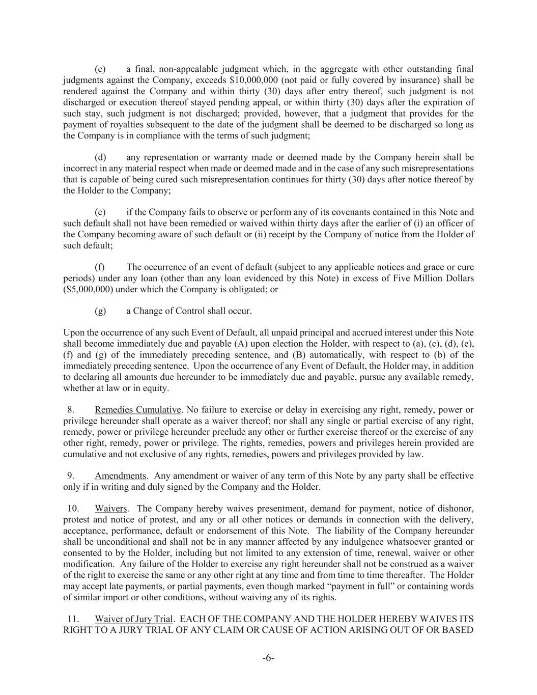 -6- (c) a final, non-appealable judgment which, in the aggregate with other outstanding final judgments against the Company, exceeds $10,000,000 (not paid or fully covered by insurance) shall be rendered against the Company and within thirty (30) days after entry thereof, such judgment is not discharged or execution thereof stayed pending appeal, or within thirty (30) days after the expiration of such stay, such judgment is not discharged; provided, however, that a judgment that provides for the payment of royalties subsequent to the date of the judgment shall be deemed to be discharged so long as the Company is in compliance with the terms of such judgment; (d) any representation or warranty made or deemed made by the Company herein shall be incorrect in any material respect when made or deemed made and in the case of any such misrepresentations that is capable of being cured such misrepresentation continues for thirty (30) days after notice thereof by the Holder to the Company; (e) if the Company fails to observe or perform any of its covenants contained in this Note and such default shall not have been remedied or waived within thirty days after the earlier of (i) an officer of the Company becoming aware of such default or (ii) receipt by the Company of notice from the Holder of such default; (f) The occurrence of an event of default (subject to any applicable notices and grace or cure periods) under any loan (other than any loan evidenced by this Note) in excess of Five Million Dollars ($5,000,000) under which the Company is obligated; or (g) a Change of Control shall occur. Upon the occurrence of any such Event of Default, all unpaid principal and accrued interest under this Note shall become immediately due and payable (A) upon election the Holder, with respect to (a), (c), (d), (e), (f) and (g) of the immediately preceding sentence, and (B) automatically, with respect to (b) of the immediately preceding sentence. Upon the occurrence of any Event of Default, the Holder may, in addition to declaring all amounts due hereunder to be immediately due and payable, pursue any available remedy, whether at law or in equity. 8. Remedies Cumulative. No failure to exercise or delay in exercising any right, remedy, power or privilege hereunder shall operate as a waiver thereof; nor shall any single or partial exercise of any right, remedy, power or privilege hereunder preclude any other or further exercise thereof or the exercise of any other right, remedy, power or privilege. The rights, remedies, powers and privileges herein provided are cumulative and not exclusive of any rights, remedies, powers and privileges provided by law. 9. Amendments. Any amendment or waiver of any term of this Note by any party shall be effective only if in writing and duly signed by the Company and the Holder. 10. Waivers. The Company hereby waives presentment, demand for payment, notice of dishonor, protest and notice of protest, and any or all other notices or demands in connection with the delivery, acceptance, performance, default or endorsement of this Note. The liability of the Company hereunder shall be unconditional and shall not be in any manner affected by any indulgence whatsoever granted or consented to by the Holder, including but not limited to any extension of time, renewal, waiver or other modification. Any failure of the Holder to exercise any right hereunder shall not be construed as a waiver of the right to exercise the same or any other right at any time and from time to time thereafter. The Holder may accept late payments, or partial payments, even though marked “payment in full” or containing words of similar import or other conditions, without waiving any of its rights. 11. Waiver of Jury Trial. EACH OF THE COMPANY AND THE HOLDER HEREBY WAIVES ITS RIGHT TO A JURY TRIAL OF ANY CLAIM OR CAUSE OF ACTION ARISING OUT OF OR BASED