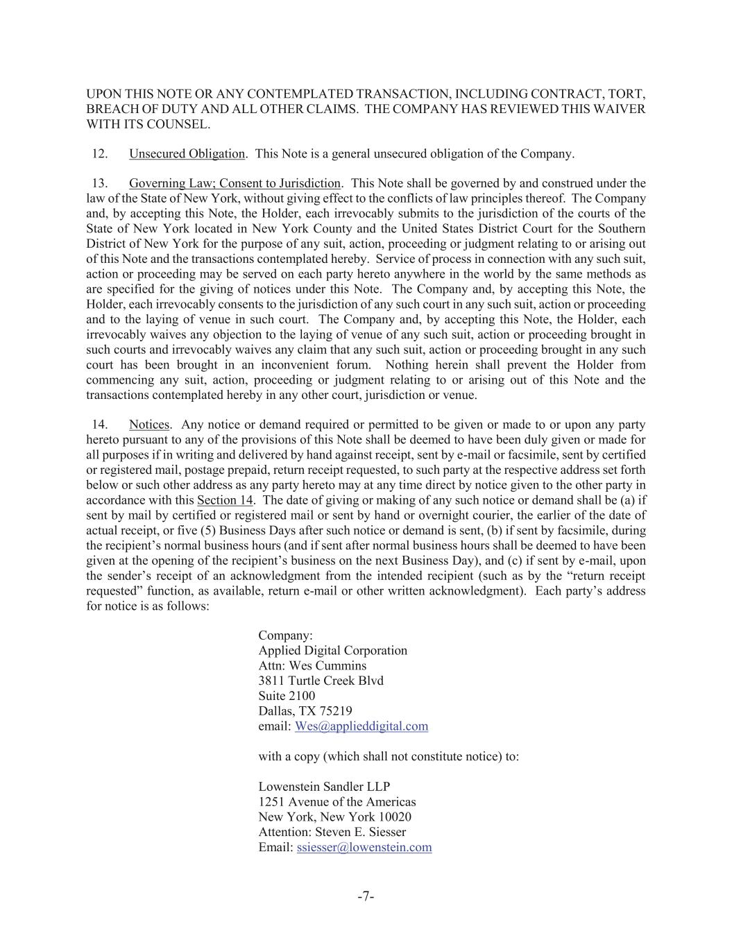 -7- UPON THIS NOTE OR ANY CONTEMPLATED TRANSACTION, INCLUDING CONTRACT, TORT, BREACH OF DUTY AND ALL OTHER CLAIMS. THE COMPANY HAS REVIEWED THIS WAIVER WITH ITS COUNSEL. 12. Unsecured Obligation. This Note is a general unsecured obligation of the Company. 13. Governing Law; Consent to Jurisdiction. This Note shall be governed by and construed under the law of the State of New York, without giving effect to the conflicts of law principles thereof. The Company and, by accepting this Note, the Holder, each irrevocably submits to the jurisdiction of the courts of the State of New York located in New York County and the United States District Court for the Southern District of New York for the purpose of any suit, action, proceeding or judgment relating to or arising out of this Note and the transactions contemplated hereby. Service of process in connection with any such suit, action or proceeding may be served on each party hereto anywhere in the world by the same methods as are specified for the giving of notices under this Note. The Company and, by accepting this Note, the Holder, each irrevocably consents to the jurisdiction of any such court in any such suit, action or proceeding and to the laying of venue in such court. The Company and, by accepting this Note, the Holder, each irrevocably waives any objection to the laying of venue of any such suit, action or proceeding brought in such courts and irrevocably waives any claim that any such suit, action or proceeding brought in any such court has been brought in an inconvenient forum. Nothing herein shall prevent the Holder from commencing any suit, action, proceeding or judgment relating to or arising out of this Note and the transactions contemplated hereby in any other court, jurisdiction or venue. 14. Notices. Any notice or demand required or permitted to be given or made to or upon any party hereto pursuant to any of the provisions of this Note shall be deemed to have been duly given or made for all purposes if in writing and delivered by hand against receipt, sent by e-mail or facsimile, sent by certified or registered mail, postage prepaid, return receipt requested, to such party at the respective address set forth below or such other address as any party hereto may at any time direct by notice given to the other party in accordance with this Section 14. The date of giving or making of any such notice or demand shall be (a) if sent by mail by certified or registered mail or sent by hand or overnight courier, the earlier of the date of actual receipt, or five (5) Business Days after such notice or demand is sent, (b) if sent by facsimile, during the recipient’s normal business hours (and if sent after normal business hours shall be deemed to have been given at the opening of the recipient’s business on the next Business Day), and (c) if sent by e-mail, upon the sender’s receipt of an acknowledgment from the intended recipient (such as by the “return receipt requested” function, as available, return e-mail or other written acknowledgment). Each party’s address for notice is as follows: Company: Applied Digital Corporation Attn: Wes Cummins 3811 Turtle Creek Blvd Suite 2100 Dallas, TX 75219 email: Wes@applieddigital.com with a copy (which shall not constitute notice) to: Lowenstein Sandler LLP 1251 Avenue of the Americas New York, New York 10020 Attention: Steven E. Siesser Email: ssiesser@lowenstein.com