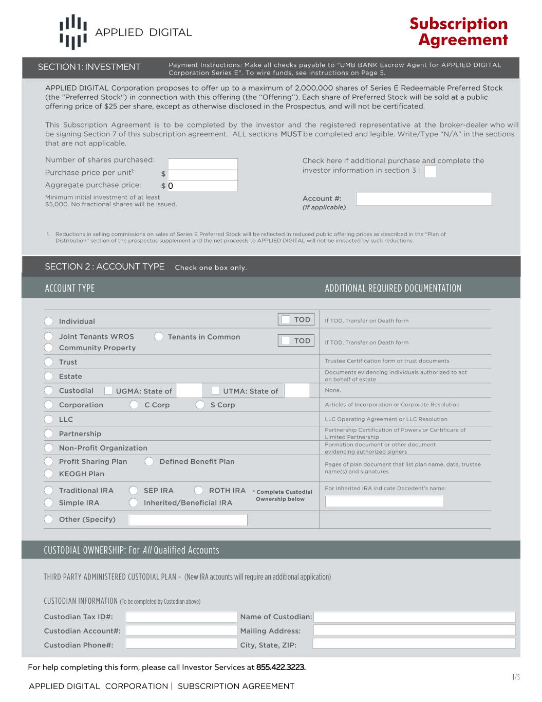 SECTION 1 : INVESTMENT $ $ Check here if additional purchase and complete the investor information in section 3 : Account #: (if applicable) 1/5 APPLIED DIGITAL Corporation proposes to offer up to a maximum of 2,000,000 shares of Series E Redeemable Preferred Stock (the "Preferred Stock") in connection with this offering (the ‘‘Offering’’). Each share of Preferred Stock will be sold at a public offering price of $25 per share, except as otherwise disclosed in the Prospectus, and will not be certificated. This Subscription Agreement is to be completed by the investor and the registered representative at the broker-dealer who will be signing Section 7 of this subscription agreement. ALL sections MUST be completed and legible. Write/Type “N/A” in the sections that are not applicable. THIRD PARTY ADMINISTERED CUSTODIAL PLAN - (New IRA accounts will require an additional application) Individual Trust Estate Custodial Corporation LLC Partnership Non-Profit Organization Profit Sharing Plan Traditional IRA Defined Benefit Plan SEP IRA ROTH IRA KEOGH Plan Simple IRA Other (Specify) Inherited/Beneficial IRA C Corp S Corp Joint Tenants WROS Community Property TOD TODTenants in Common ACCOUNT TYPE ADDITIONAL REQUIRED DOCUMENTATION CUSTODIAL OWNERSHIP: For All Qualified Accounts If TOD, Transfer on Death form Trustee Certification form or trust documents Articles of Incorporation or Corporate Resolution LLC Operating Agreement or LLC Resolution Formation document or other document evidencing authorized signers Pages of plan document that list plan name, date, trustee name(s) and signatures * Complete Custodial Ownership below For Inherited IRA indicate Decedent’s name: Partnership Certification of Powers or Certificare of Limited Partnership None. Documents evidencing individuals authorized to act on behalf of estate If TOD, Transfer on Death form UGMA: State of UTMA: State of Custodian Tax ID#: Custodian Account#: Custodian Phone#: Name of Custodian: Mailing Address: City, State, ZIP: CUSTODIAN INFORMATION (To be completed by Custodian above) Payment Instructions: Make all checks payable to "UMB BANK Escrow Agent for APPLIED DIGITAL Corporation Series E". To wire funds, see instructions on Page 5. Subscription Agreement Number of shares purchased: Purchase price per unit1: Aggregate purchase price: SECTION 2 : ACCOUNT TYPE Check one box only. For help completing this form, please call Investor Services at 855.422.3223. APPLIED DIGITAL CORPORATION | SUBSCRIPTION AGREEMENT Minimum initial investment of at least $5,000. No fractional shares will be issued. 1. Reductions in selling commissions on sales of Series E Preferred Stock will be reflected in reduced public offering prices as described in the “Plan of Distribution” section of the prospectus supplement and the net proceeds to APPLIED DIGITAL will not be impacted by such reductions. 0