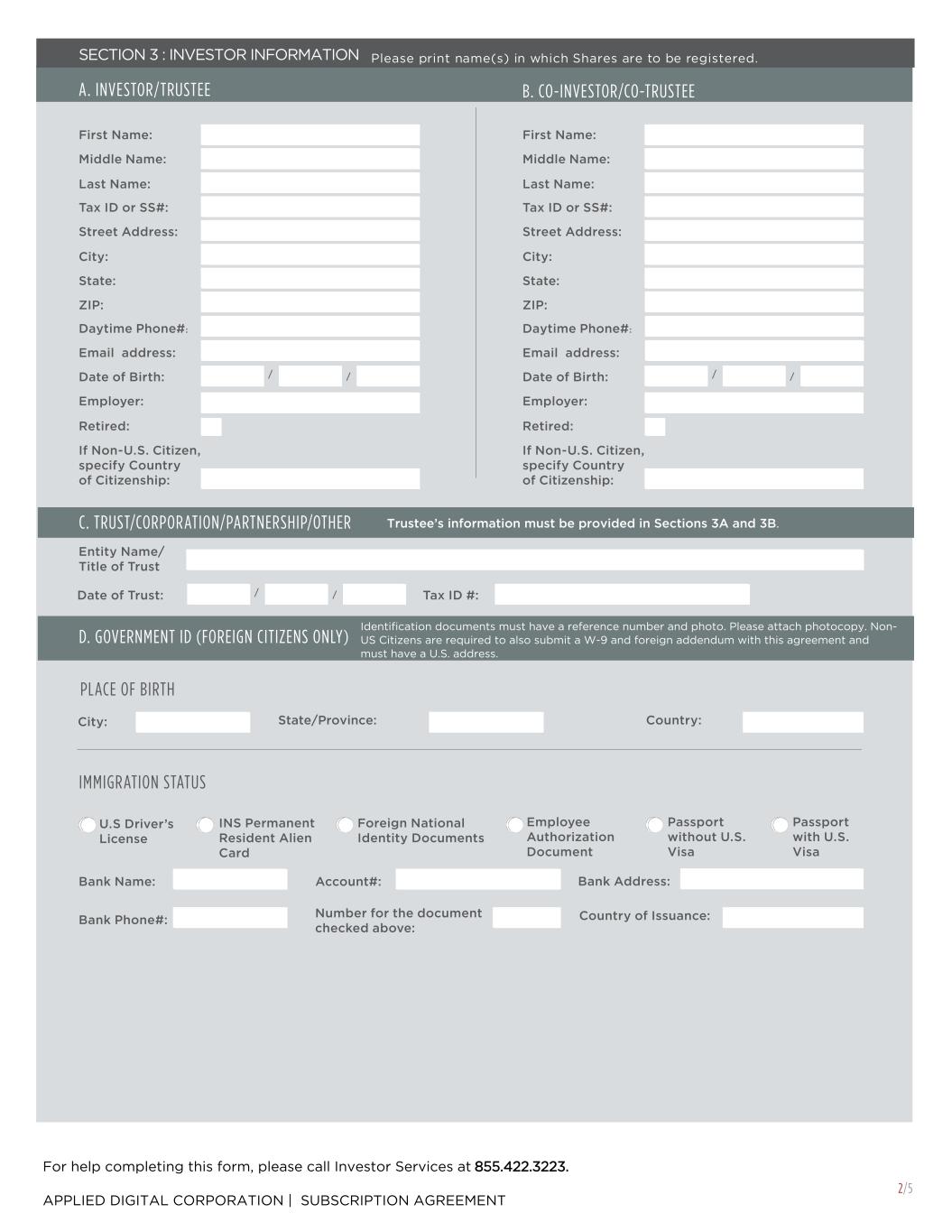Date of Trust: Entity Name/ Title of Trust City: Bank Name: Bank Phone#: U.S Driver’s License Employee Authorization Document INS Permanent Resident Alien Card Foreign National Identity Documents Passport without U.S. Visa Passport with U.S. Visa Trustee’s information must be provided in Sections 3A and 3B. Identification documents must have a reference number and photo. Please attach photocopy. Non- US Citizens are required to also submit a W-9 and foreign addendum with this agreement and must have a U.S. address. PLACE OF BIRTH IMMIGRATION STATUS C. TRUST/CORPORATION/PARTNERSHIP/OTHER D. GOVERNMENT ID (FOREIGN CITIZENS ONLY) 2/5 A. INVESTOR/TRUSTEE B. CO-INVESTOR/CO-TRUSTEE Tax ID #: State/Province: Country: Account#: Country of Issuance: Bank Address: Number for the document checked above: First Name: Middle Name: Last Name: Tax ID or SS#: Street Address: City: State: ZIP: Daytime Phone#: Email address: Date of Birth: Employer: Retired: If Non-U.S. Citizen, specify Country of Citizenship: First Name: Middle Name: Last Name: Tax ID or SS#: Street Address: City: State: ZIP: Daytime Phone#: Email address: Date of Birth: Employer: Retired: If Non-U.S. Citizen, specify Country of Citizenship: For help completing this form, please call Investor Services at 855.422.3223. APPLIED DIGITAL CORPORATION | SUBSCRIPTION AGREEMENT SECTION 3 : INVESTOR INFORMATION Please print name(s) in which Shares are to be registered.
