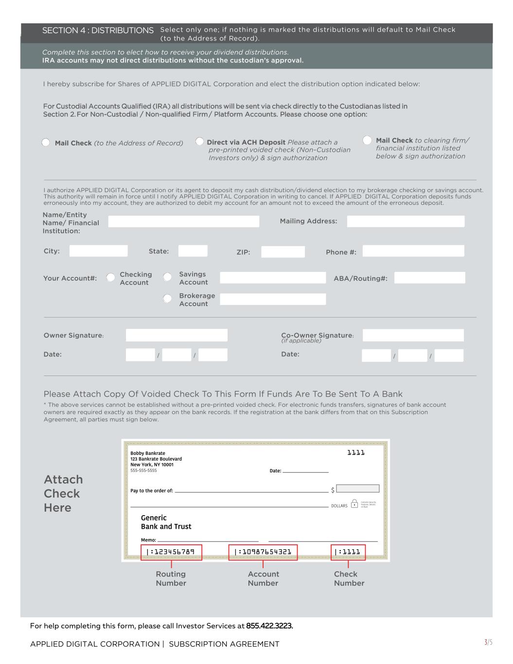 Owner Signature: Please Attach Copy Of Voided Check To This Form If Funds Are To Be Sent To A Bank * The above services cannot be established without a pre-printed voided check. For electronic funds transfers, signatures of bank account owners are required exactly as they appear on the bank records. If the registration at the bank differs from that on this Subscription Agreement, all parties must sign below. Date: Co-Owner Signature: (if applicable) Date: Name/Entity Name/ Financial Institution: I authorize APPLIED DIGITAL Corporation or its agent to deposit my cash distribution/dividend election to my brokerage checking or savings account. This authority will remain in force until I notify APPLIED DIGITAL Corporation in writing to cancel. If APPLIED DIGITAL Corporation deposits funds erroneously into my account, they are authorized to debit my account for an amount not to exceed the amount of the erroneous deposit. Mailing Address: City: State: ZIP: Phone #: Checking Account Savings Account Brokerage Account ABA/Routing#:Your Account#: 3/5 Complete this section to elect how to receive your dividend distributions. IRA accounts may not direct distributions without the custodian’s approval. I hereby subscribe for Shares of APPLIED DIGITAL Corporation and elect the distribution option indicated below: For Custodial Accounts Qualified (IRA) all distributions will be sent via check directly to the Custodian as listed in Section 2. For Non-Custodial / Non-qualified Firm / Platform Accounts. Please choose one option: Direct via ACH Deposit Please attach a pre-printed voided check (Non-Custodian Investors only) & sign authorization Mail Check to clearing firm/ financial institution listed below & sign authorization Bobby Bankrate 123 Bankrate Boulevard New York, NY 10001 555-555-5555 Pay to the order of: Memo: DOLLARS $ Generic Bank and Trust Date: |:123456789 |:10987654321 |:1111 1111 Contains Security Features. Details on Back Attach Check Here Routing Number Account Number Check Number Select only one; if nothing is marked the distributions will default to Mail Check (to the Address of Record). SECTION 4 : DISTRIBUTIONS Mail Check (to the Address of Record) For help completing this form, please call Investor Services at 855.422.3223. APPLIED DIGITAL CORPORATION | SUBSCRIPTION AGREEMENT