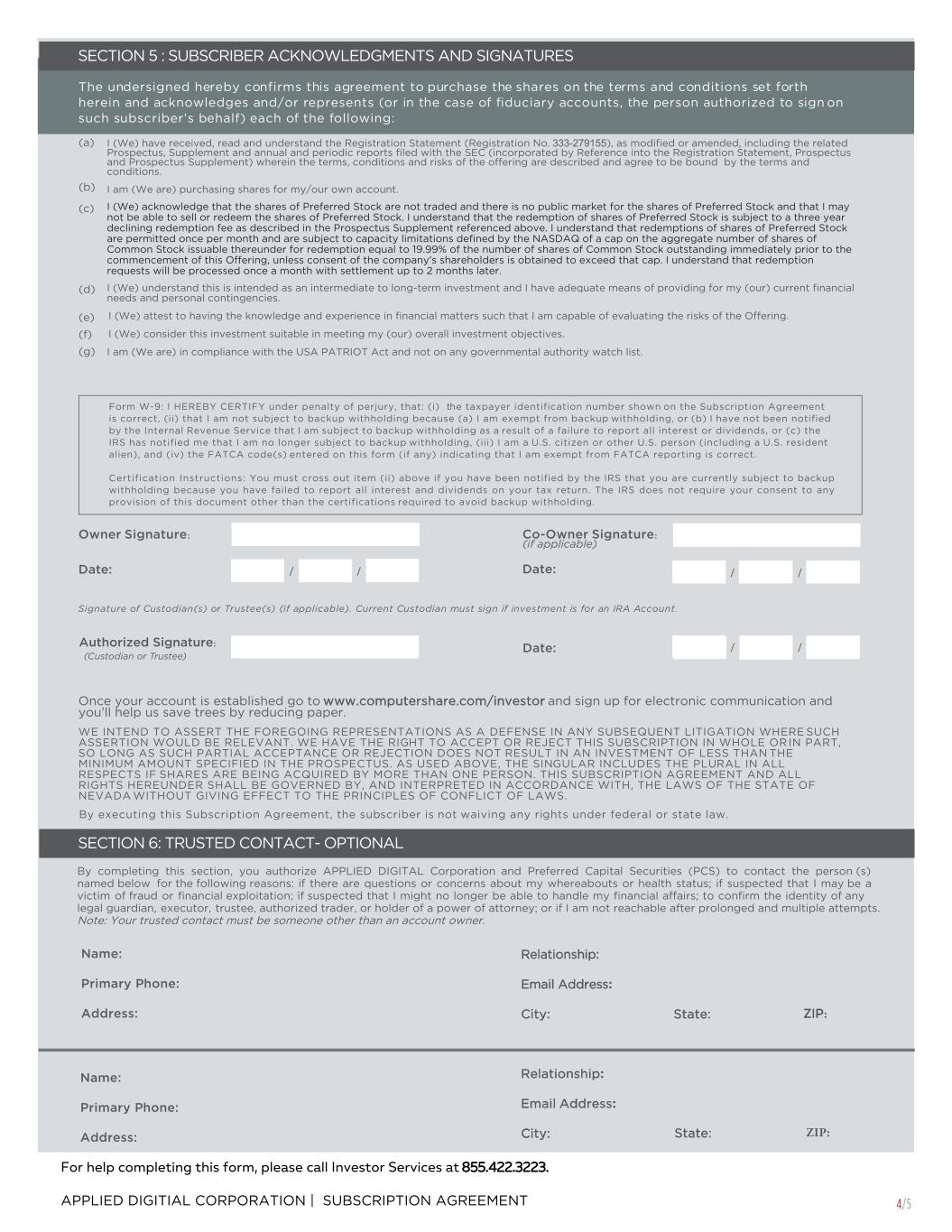 4/5 Once your account is established go to www.computershare.com/investor and sign up for electronic communication and you’ll help us save trees by reducing paper. WE INTEND TO ASSERT THE FOREGOING REPRESENTATIONS AS A DEFENSE IN ANY SUBSEQUENT LITIGATION WHERE SUCH ASSERTION WOULD BE RELEVANT. WE HAVE THE RIGHT TO ACCEPT OR REJECT THIS SUBSCRIPTION IN WHOLE OR IN PART, SO LONG AS SUCH PARTIAL ACCEPTANCE OR REJECTION DOES NOT RESULT IN AN INVESTMENT OF LESS THAN THE MINIMUM AMOUNT SPECIFIED IN THE PROSPECTUS. AS USED ABOVE, THE SINGULAR INCLUDES THE PLURAL IN ALL RESPECTS IF SHARES ARE BEING ACQUIRED BY MORE THAN ONE PERSON. THIS SUBSCRIPTION AGREEMENT AND ALL RIGHTS HEREUNDER SHALL BE GOVERNED BY, AND INTERPRETED IN ACCORDANCE WITH, THE LAWS OF THE STATE OF NEVADA WITHOUT GIVING EFFECT TO THE PRINCIPLES OF CONFLICT OF LAWS. By executing this Subscription Agreement, the subscriber is not waiving any rights under federal or state law. I (We) have received, read and understand the Registration Statement (Registration No. 333-279155), as modified or amended, including the related Prospectus, Supplement and annual and periodic reports filed with the SEC (incorporated by Reference into the Registration Statement, Prospectus and Prospectus Supplement) wherein the terms, conditions and risks of the offering are described and agree to be bound by the terms and conditions. I am (We are) purchasing shares for my/our own account. I (We) acknowledge that the shares of Preferred Stock are not traded and there is no public market for the shares of Preferred Stock and that I may not be able to sell or redeem the shares of Preferred Stock. I understand that the redemption of shares of Preferred Stock is subject to a three year declining redemption fee as described in the Prospectus Supplement referenced above. I understand that redemptions of shares of Preferred Stock are permitted once per month and are subject to capacity limitations defined by the NASDAQ of a cap on the aggregate number of shares of Common Stock issuable thereunder for redemption equal to 19.99% of the number of shares of Common Stock outstanding immediately prior to the commencement of this Offering, unless consent of the company's shareholders is obtained to exceed that cap. I understand that redemption requests will be processed once a month with settlement up to 2 months later. I (We) understand this is intended as an intermediate to long-term investment and I have adequate means of providing for my (our) current financial needs and personal contingencies. I (We) attest to having the knowledge and experience in financial matters such that I am capable of evaluating the risks of the Offering. I (We) consider this investment suitable in meeting my (our) overall investment objectives. I am (We are) in compliance with the USA PATRIOT Act and not on any governmental authority watch list. (a) (b) (c) Form W-9: I HEREBY CERTIFY under penalty of perjury, that: (i) the taxpayer identification number shown on the Subscription Agreement is correct, (ii) that I am not subject to backup withholding because (a) I am exempt from backup withholding, or (b) I have not been notified by the Internal Revenue Service that I am subject to backup withholding as a result of a failure to report all interest or dividends, or (c) the IRS has notified me that I am no longer subject to backup withholding, (iii) I am a U.S. citizen or other U.S. person (including a U.S. resident alien), and (iv) the FATCA code(s) entered on this form (if any) indicating that I am exempt from FATCA reporting is correct. Certification Instructions: You must cross out item (ii) above if you have been notified by the IRS that you are currently subject to backup withholding because you have failed to report all interest and dividends on your tax return. The IRS does not require your consent to any provision of this document other than the certifications required to avoid backup withholding. Authorized Signature: Signature of Custodian(s) or Trustee(s) (if applicable). Current Custodian must sign if investment is for an IRA Account. (Custodian or Trustee) Owner Signature: Date: Date: Co-Owner Signature: (if applicable) Date: The undersigned hereby confirms this agreement to purchase the shares on the terms and conditions set forth herein and acknowledges and/or represents (or in the case of fiduciary accounts, the person authorized to sign on such subscriber’s behalf) each of the following: SECTION 5 : SUBSCRIBER ACKNOWLEDGMENTS AND SIGNATURES (d) (e) (f) (g) SECTION 6: TRUSTED CONTACT- OPTIONAL By completing this section, you authorize APPLIED DIGITAL Corporation and Preferred Capital Securities (PCS) to contact the person (s) named below for the following reasons: if there are questions or concerns about my whereabouts or health status; if suspected that I may be a victim of fraud or financial exploitation; if suspected that I might no longer be able to handle my financial affairs; to confirm the identity of any legal guardian, executor, trustee, authorized trader, or holder of a power of attorney; or if I am not reachable after prolonged and multiple attempts. Note: Your trusted contact must be someone other than an account owner. Name: Primary Phone: Address: Name: Primary Phone: Address: State: ZIP: Relationship: Email Address: City: Relationship: Email Address: City: State: ZIP: For help completing this form, please call Investor Services at 855.422.3223. APPLIED DIGITIAL CORPORATION | SUBSCRIPTION AGREEMENT