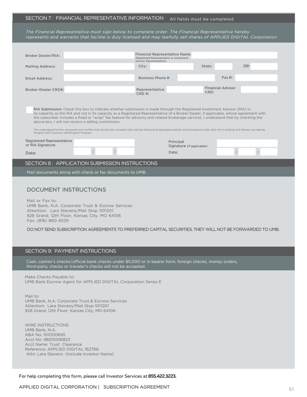 The Financial Representative must sign below to complete order. The Financial Representative hereby represents and warrants that he/she is duly licensed and may lawfully sell shares of APPLIED DIGITAL Corporation Financial Advisor CRD: Financial Representative Name: (Registered Representative or Investment Advisor Representative) Mailing Address: City: Email Address: Broker-Dealer CRD#: Representative CRD #: State: ZIP: Business Phone #: Fax #: Broker Dealer/RIA: Registered Representative or RIA Signature: Date: Principal Signature (if applicable): Date: 5/5 DOCUMENT INSTRUCTIONS Mail or Fax to: UMB Bank, N.A. Corporate Trust & Escrow Services Attention: Lara Stevens/Mail Stop 1011201 928 Grand, 12th Floor, Kansas City, MO 64106 Fax: (816) 860-3029 All fields must be completedSECTION 7 : FINANCIAL REPRESENTATIVE INFORMATION SECTION 8 : APPLICATION SUBMISSION INSTRUCTIONS Cash, cashier’s checks/official bank checks under $5,000 or in bearer form, foreign checks, money orders, third-party checks or traveler’s checks will not be accepted. SECTION 9: PAYMENT INSTRUCTIONS Mail documents along with check or fax documents to UMB. Make Checks Payable to: UMB Bank Escrow Agent for APPLIED DIGITAL Corporation Series E Mail to: UMB Bank, N.A. Corporate Trust & Escrow Services Attention: Lara Stevens/Mail Stop 1011201 928 Grand, 12th Floor, Kansas City, MO 64106 WIRE INSTRUCTIONS UMB Bank, N.A. ABA No: 101000695 Acct No: 9800006823 Acct Name: Trust Clearance Reference: APPLIED DIGITAL 162766 Attn: Lara Stevens (Include Investor Name) DO NOT SEND SUBSCRIPTION AGREEMENTS TO PREFERRED CAPITAL SECURITIES. THEY WILL NOT BE FORWARDED TO UMB. For help completing this form, please call Investor Services at 855.422.3223. APPLIED DIGITAL CORPORATION | SUBSCRIPTION AGREEMENT RIA Submission: Check this box to indicate whether submission is made through the Registered Investment Advisor (RIA) in its capacity as the RIA and not in its capacity as a Registered Representative of a Broker-Dealer, if applicable, whose agreement with the subscriber includes a fixed or "wrap" fee feature for advisory and related brokerage services. I understand that by checking the above box, I will not receive a selling commission. The undersigned further represents and certifies that he/she has complied with and has followed all applicable policies and procedures under their firm's existing Anti-Money Laundering Program and Customer Identification Program.