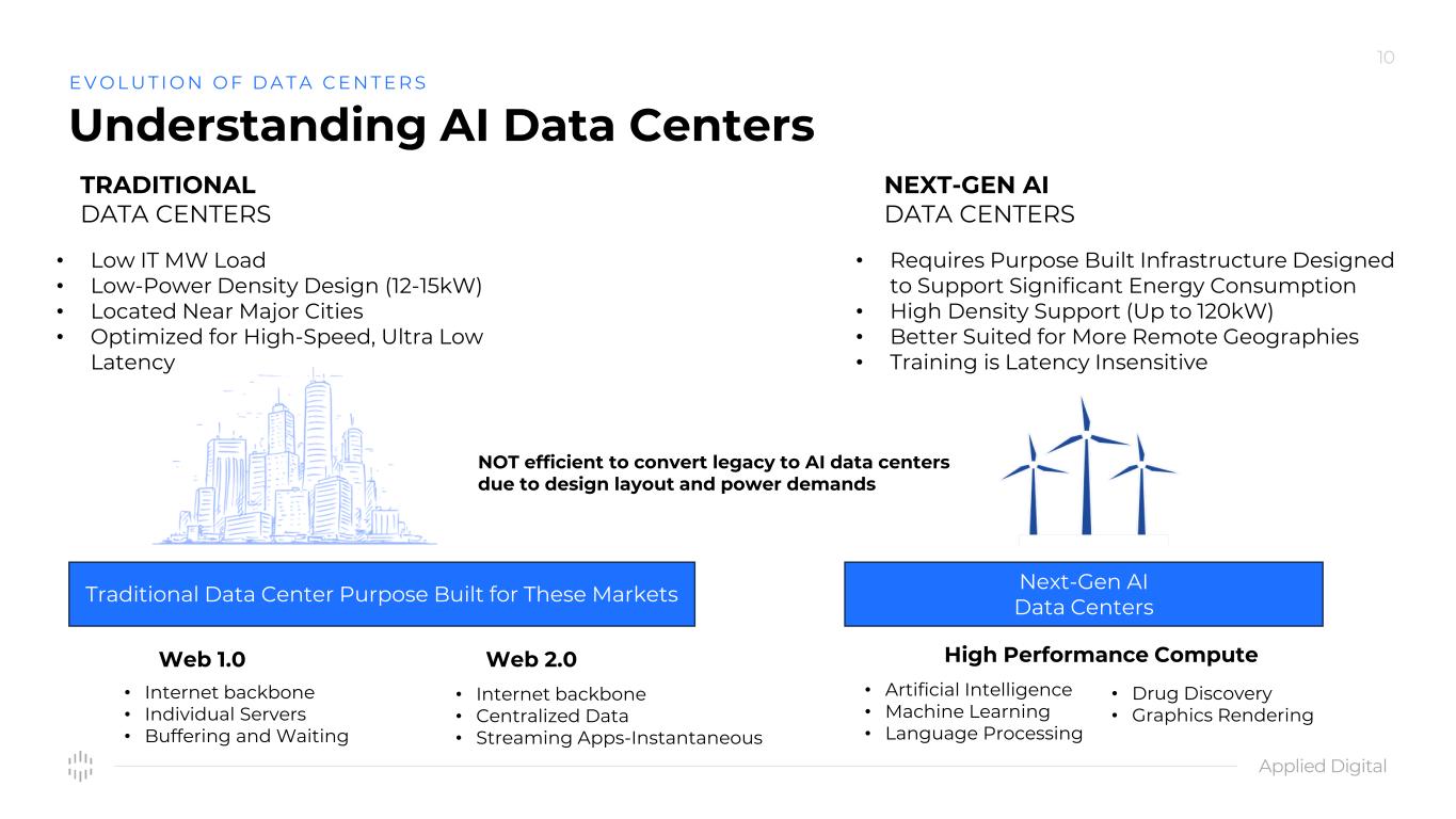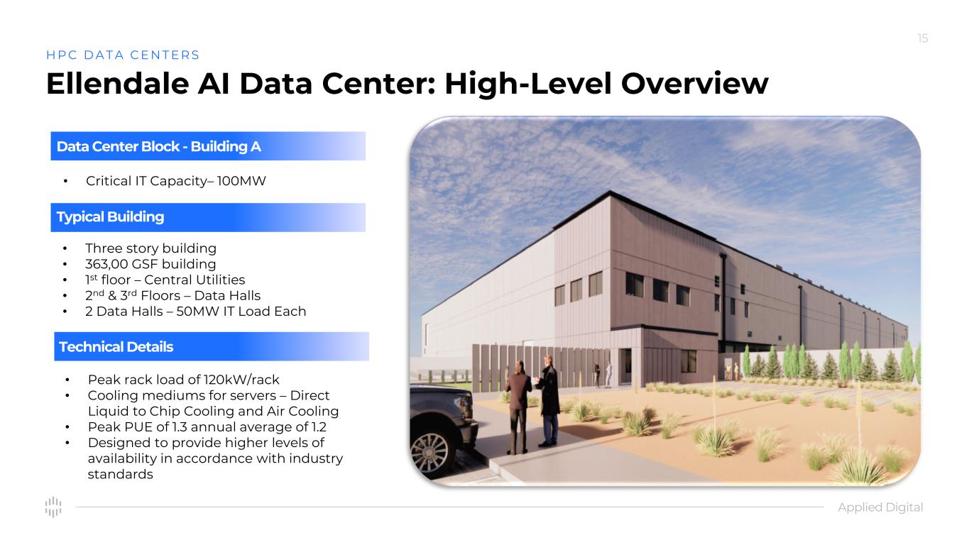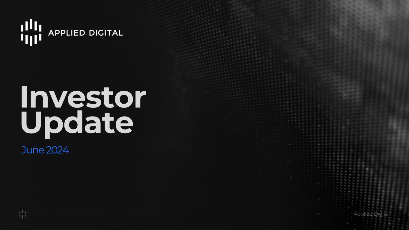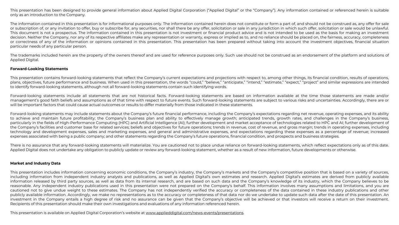 This presentation has been designed to provide general information about Applied Digital Corporation (“Applied Digital” or the “Company”). Any information contained or referenced herein is suitable only as an introduction to the Company. The information contained in this presentation is for informational purposes only. The information contained herein does not constitute or form a part of, and should not be construed as, any offer for sale or subscription of, or any invitation to offer, buy or subscribe for, any securities, nor shall there be any offer, solicitation or sale in any jurisdiction in which such offer, solicitation or sale would be unlawful. This document is not a prospectus. The information contained in this presentation is not investment or financial product advice and is not intended to be used as the basis for making an investment decision. Neither the Company, nor any of its respective affiliates make any representation or warranty, express or implied as to, and no reliance should be placed on, the fairness, accuracy, completeness or correctness of any of the information or opinions contained in this presentation. This presentation has been prepared without taking into account the investment objectives, financial situation particular needs of any particular person. The trademarks included herein are the property of the owners thereof and are used for reference purposes only. Such use should not be construed as an endorsement of the platform and solutions of Applied Digital. Forward-Looking Statements This presentation contains forward-looking statements that reflect the Company’s current expectations and projections with respect to, among other things, its financial condition, results of operations, plans, objectives, future performance and business. When used in this presentation, the words “could,” “believe,” “anticipate,” “intend,” “estimate,” “expect,” “project” and similar expressions are intended to identify forward-looking statements, although not all forward-looking statements contain such identifying words. Forward-looking statements include all statements that are not historical facts. Forward-looking statements are based on information available at the time those statements are made and/or management’s good faith beliefs and assumptions as of that time with respect to future events. Such forward-looking statements are subject to various risks and uncertainties. Accordingly, there are or will be important factors that could cause actual outcomes or results to differ materially from those indicated in these statements. Forward-looking statements may include statements about the Company’s future financial performance, including the Company’s expectations regarding net revenue, operating expenses, and its ability to achieve and maintain future profitability; the Company’s business plan and ability to effectively manage growth; anticipated trends, growth rates, and challenges in the Company’s business, particularly in the fields of High-Performance Computing (HPC) and Artificial Intelligence (AI); further development and market acceptance of technologies related to HPC and AI; further development of the Company’s facilities and customer base for related services; beliefs and objectives for future operations; trends in revenue, cost of revenue, and gross margin; trends in operating expenses, including technology and development expenses, sales and marketing expenses, and general and administrative expenses, and expectations regarding these expenses as a percentage of revenue; increased expenses associated with being a public company; and other statements regarding the Company’s future operations, financial condition, and prospects and business strategies. There is no assurance that any forward-looking statements will materialize. You are cautioned not to place undue reliance on forward-looking statements, which reflect expectations only as of this date. Applied Digital does not undertake any obligation to publicly update or review any forward-looking statement, whether as a result of new information, future developments or otherwise. Market and Industry Data This presentation includes information concerning economic conditions, the Company’s industry, the Company’s markets and the Company’s competitive position that is based on a variety of sources, including information from independent industry analysts and publications, as well as Applied Digital’s own estimates and research. Applied Digital’s estimates are derived from publicly available information released by third party sources, as well as data from its internal research, and are based on such data and the Company’s knowledge of its industry, which the Company believes to be reasonable. Any independent industry publications used in this presentation were not prepared on the Company’s behalf. This information involves many assumptions and limitations, and you are cautioned not to give undue weight to these estimates. The Company has not independently verified the accuracy or completeness of the data contained in these industry publications and other publicly available information. Accordingly, we make no representations as to the accuracy or completeness of that data nor do we undertake to update such data after the date of this presentation. An investment in the Company entails a high degree of risk and no assurance can be given that the Company’s objective will be achieved or that investors will receive a return on their investment. Recipients of this presentation should make their own investigations and evaluations of any information referenced herein. This presentation is available on Applied Digital Corporation’s website at www.applieddigital.com/news-events/presentations.