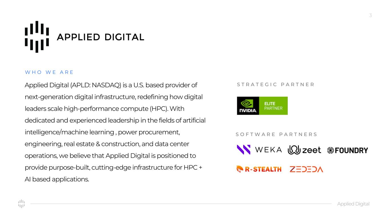 W H O W E A R E Applied Digital (APLD: NASDAQ) is a U.S. based provider of next-generation digital infrastructure, redefining how digital leaders scale high-performance compute (HPC). With dedicated and experienced leadership in the fields of artificial intelligence/machine learning , power procurement, engineering, real estate & construction, and data center operations, we believe that Applied Digital is positioned to provide purpose-built, cutting-edge infrastructure for HPC + AI based applications. S O F T W A R E P A R T N E R S S T R A T E G I C P A R T N E R
