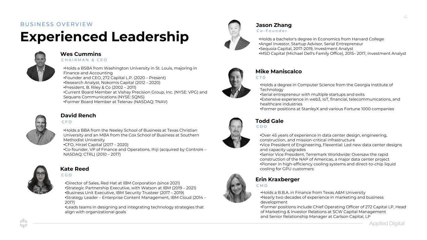 C H A I R M A N & C E O Wes Cummins C F O David Rench C T O Mike Maniscalco C D O Todd Gale C M O Erin Kraxberger C G O Kate Reed •Director of Sales, Red Hat at IBM Corporation (since 2021) •Strategic Partnership Executive, with Watson at IBM (2019 – 2021) •Business Unit Executive, IBM Security Trusteer (2017 – 2019) •Strategy Leader – Enterprise Content Management, IBM Cloud (2014 – 2017) •Leads teams in designing and integrating technology strategies that align with organizational goals •Holds a BBA from the Neeley School of Business at Texas Christian University and an MBA from the Cox School of Business at Southern Methodist University •CFO, Hirzel Capital (2017 – 2020) •Co-founder, VP of Finance and Operations, Ihiji (acquired by Control4 – NASDAQ: CTRL) (2010 – 2017) •Holds a BSBA from Washington University in St. Louis, majoring in Finance and Accounting •Founder and CEO, 272 Capital L.P. (2020 – Present) •Research Analyst, Nokomis Capital (2012 – 2020) •President, B. Riley & Co (2002 – 2011) •Current Board Member at Vishay Precision Group, Inc. (NYSE: VPG) and Sequans Communications (NYSE: SQNS) •Former Board Member at Telenav (NASDAQ: TNAV) •Holds a degree in Computer Science from the Georgia Institute of Technology •Serial entrepreneur with multiple startups and exits •Extensive experience in web3, IoT, financial, telecommunications, and healthcare industries •Former positions at StanleyX and various Fortune 1000 companies •Over 45 years of experience in data center design, engineering, construction, and mission-critical infrastructure •Vice President of Engineering, Flexential: Led new data center designs and capacity upgrades •Senior Vice President, Terremark Worldwide: Oversaw the rapid construction of the NAP of Americas, a major data center project •Pioneer in high-efficiency cooling systems and direct-to-chip liquid cooling for GPU customers •Holds a B.B.A. in Finance from Texas A&M University •Nearly two decades of experience in marketing and business development •Former positions include Chief Operating Officer of 272 Capital LP, Head of Marketing & Investor Relations at SCW Capital Management and Senior Relationship Manager at Carlson Capital, LP C o - F o u n d e r Jason Zhang •Holds a bachelor's degree in Economics from Harvard College •Angel Investor, Startup Advisor, Serial Entrepreneur •Sequoia Capital, 2017-2019, Investment Analyst •MSD Capital (Michael Dell's Family Office), 2015– 2017, Investment Analyst Experienced Leadership B U S I N E S S O V E R V I E W