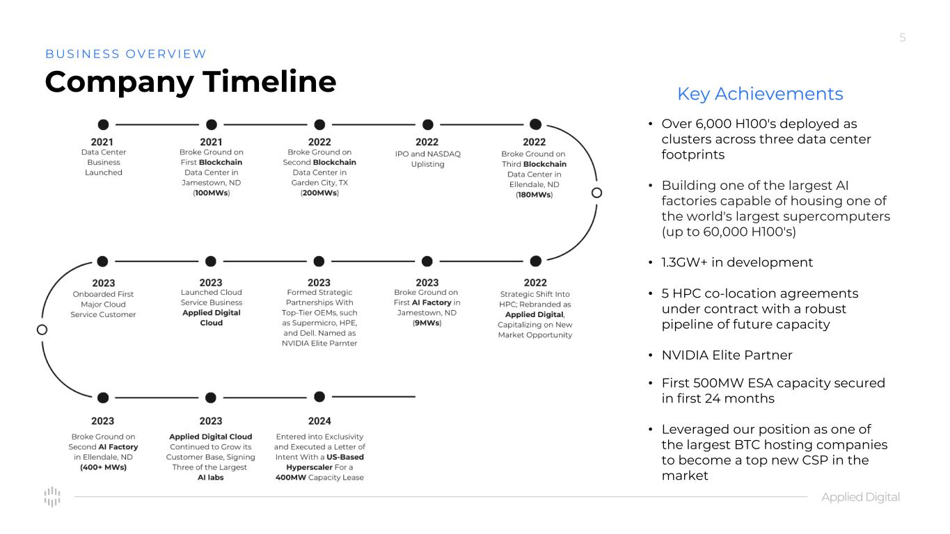 Key Achievements • Over 6,000 H100's deployed as clusters across three data center footprints • Building one of the largest AI factories capable of housing one of the world's largest supercomputers (up to 60,000 H100's) • 1.3GW+ in development • 5 HPC co-location agreements under contract with a robust pipeline of future capacity • NVIDIA Elite Partner • First 500MW ESA capacity secured in first 24 months • Leveraged our position as one of the largest BTC hosting companies to become a top new CSP in the market Company Timeline B U S I N E S S O V E R V I E W