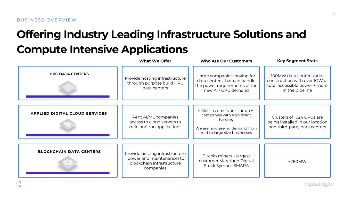 HPC DATA CENTERS BLOCKCHAIN DATA CENTERS Provide hosting infrastructure through purpose build HPC data centers Rent AI/ML companies access to cloud servers to train and run applications Provide hosting infrastructure (power and maintenance) to blockchain infrastructure companies What We Offer Who Are Our Customers Large companies looking for data centers that can handle the power requirements of the new AI / GPU demand Initial customers are startup AI companies with significant funding We are now seeing demand from mid to large size businesses Bitcoin miners – largest customer Marathon Digital Stock Symbol: $MARA 100MW data center under construction with over 1GW of total accessible power + more in the pipeline Clusters of 1024 GPUs are being installed in our location and third-party data centers In Development ~280MW Operating Key Segment Stats B U S I N E S S O V E R V I E W Offering Industry Leading Infrastructure Solutions and Compute Intensive Applications APPLIED DIGITAL CLOUD SERVICES