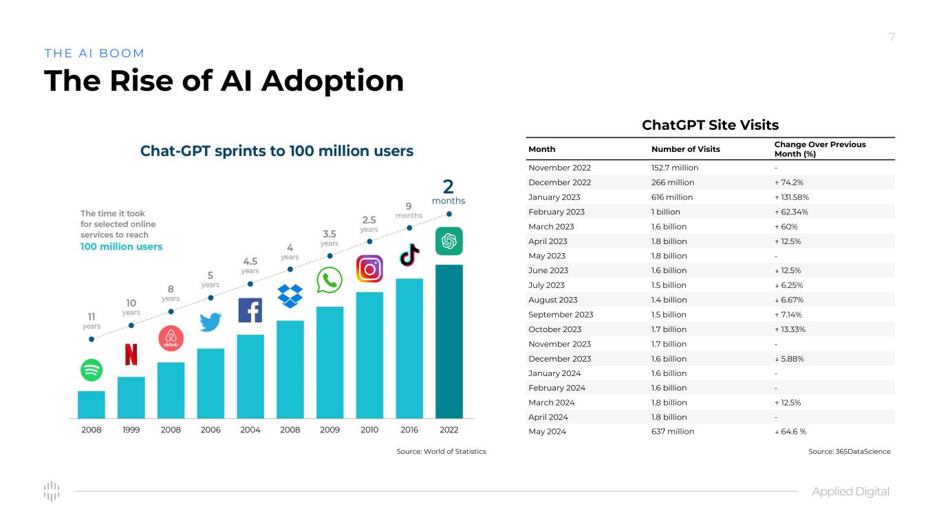 Month Number of Visits Change Over Previous Month (%) November 2022 152.7 million - December 2022 266 million ↑ 74.2% January 2023 616 million ↑ 131.58% February 2023 1 billion ↑ 62.34% March 2023 1.6 billion ↑ 60% April 2023 1.8 billion ↑ 12.5% May 2023 1.8 billion - June 2023 1.6 billion ↓ 12.5% July 2023 1.5 billion ↓ 6.25% August 2023 1.4 billion ↓ 6.67% September 2023 1.5 billion ↑ 7.14% October 2023 1.7 billion ↑ 13.33% November 2023 1.7 billion - December 2023 1.6 billion ↓ 5.88% January 2024 1.6 billion - February 2024 1.6 billion - March 2024 1.8 billion ↑ 12.5% April 2024 1.8 billion - May 2024 637 million ↓ 64.6 % Source: World of Statistics Source: 365DataScience The Rise of AI Adoption T H E A I B O O M ChatGPT Site Visits