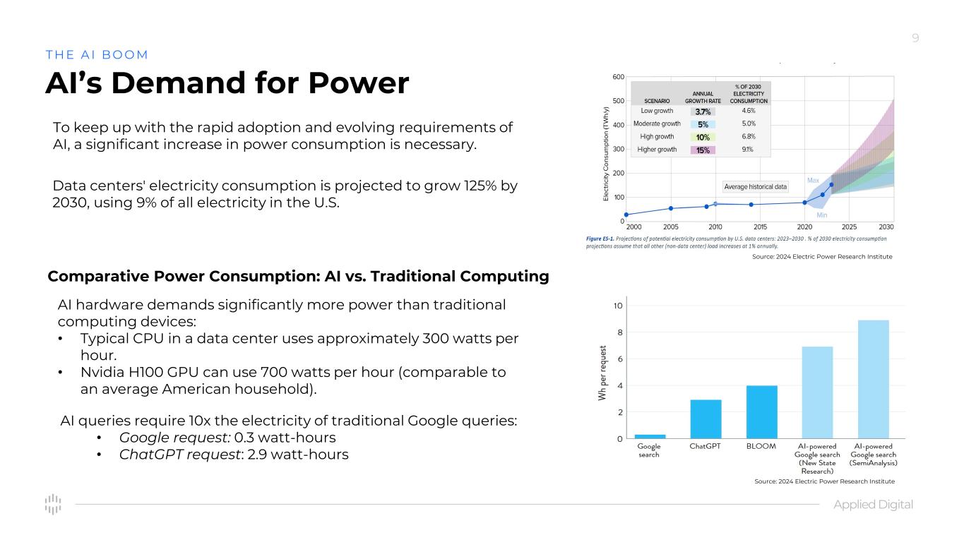 AI’s Demand for Power T H E A I B O O M AI queries require 10x the electricity of traditional Google queries: • Google request: 0.3 watt-hours • ChatGPT request: 2.9 watt-hours To keep up with the rapid adoption and evolving requirements of AI, a significant increase in power consumption is necessary. AI hardware demands significantly more power than traditional computing devices: • Typical CPU in a data center uses approximately 300 watts per hour. • Nvidia H100 GPU can use 700 watts per hour (comparable to an average American household). Data centers' electricity consumption is projected to grow 125% by 2030, using 9% of all electricity in the U.S. Comparative Power Consumption: AI vs. Traditional Computing Source: 2024 Electric Power Research Institute Source: 2024 Electric Power Research Institute