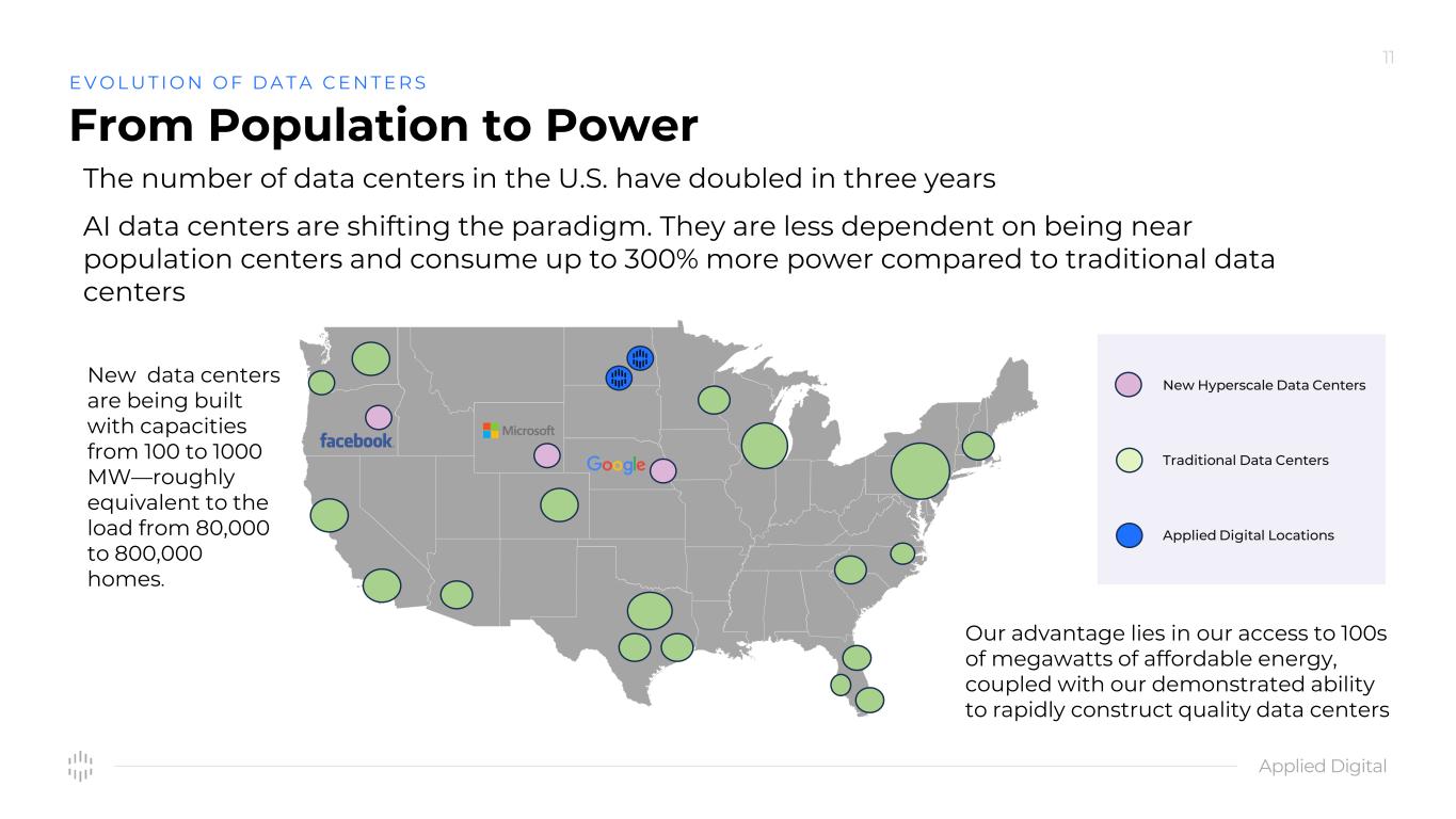 From Population to Power E V O L U T I O N O F D A T A C E N T E R S The number of data centers in the U.S. have doubled in three years AI data centers are shifting the paradigm. They are less dependent on being near population centers and consume up to 300% more power compared to traditional data centers New data centers are being built with capacities from 100 to 1000 MW—roughly equivalent to the load from 80,000 to 800,000 homes. Our advantage lies in our access to 100s of megawatts of affordable energy, coupled with our demonstrated ability to rapidly construct quality data centers New Hyperscale Data Centers Traditional Data Centers Applied Digital Locations