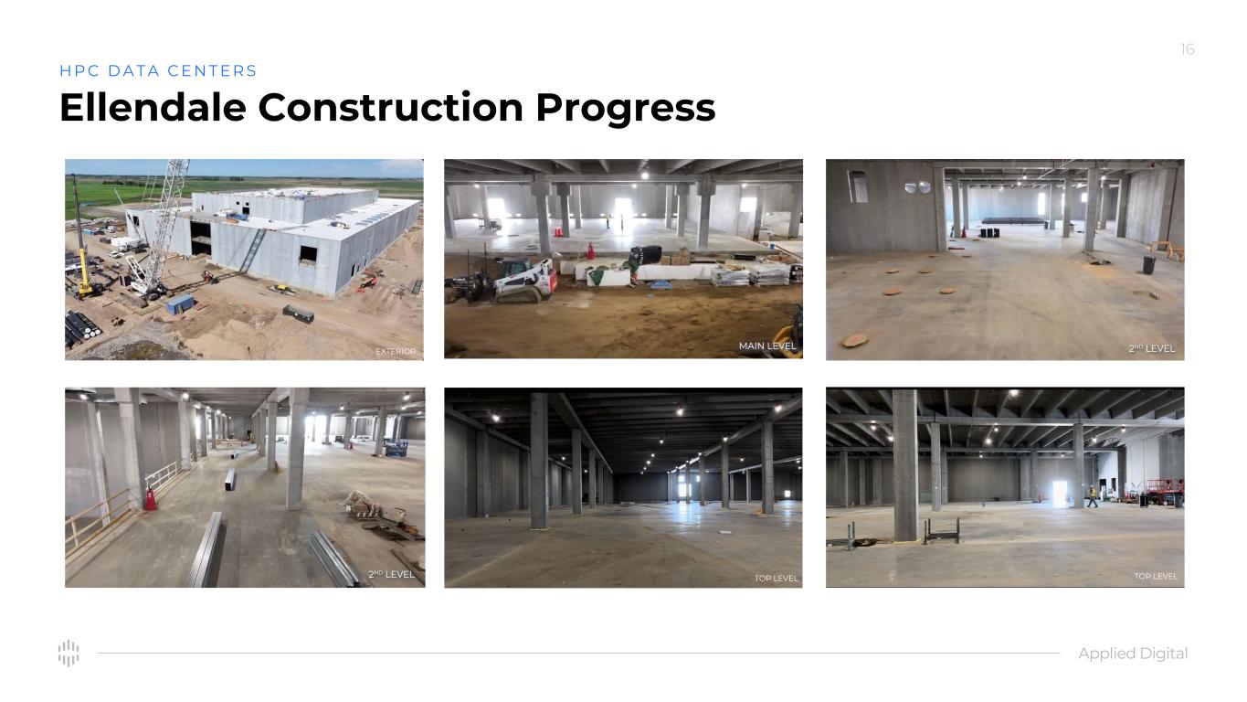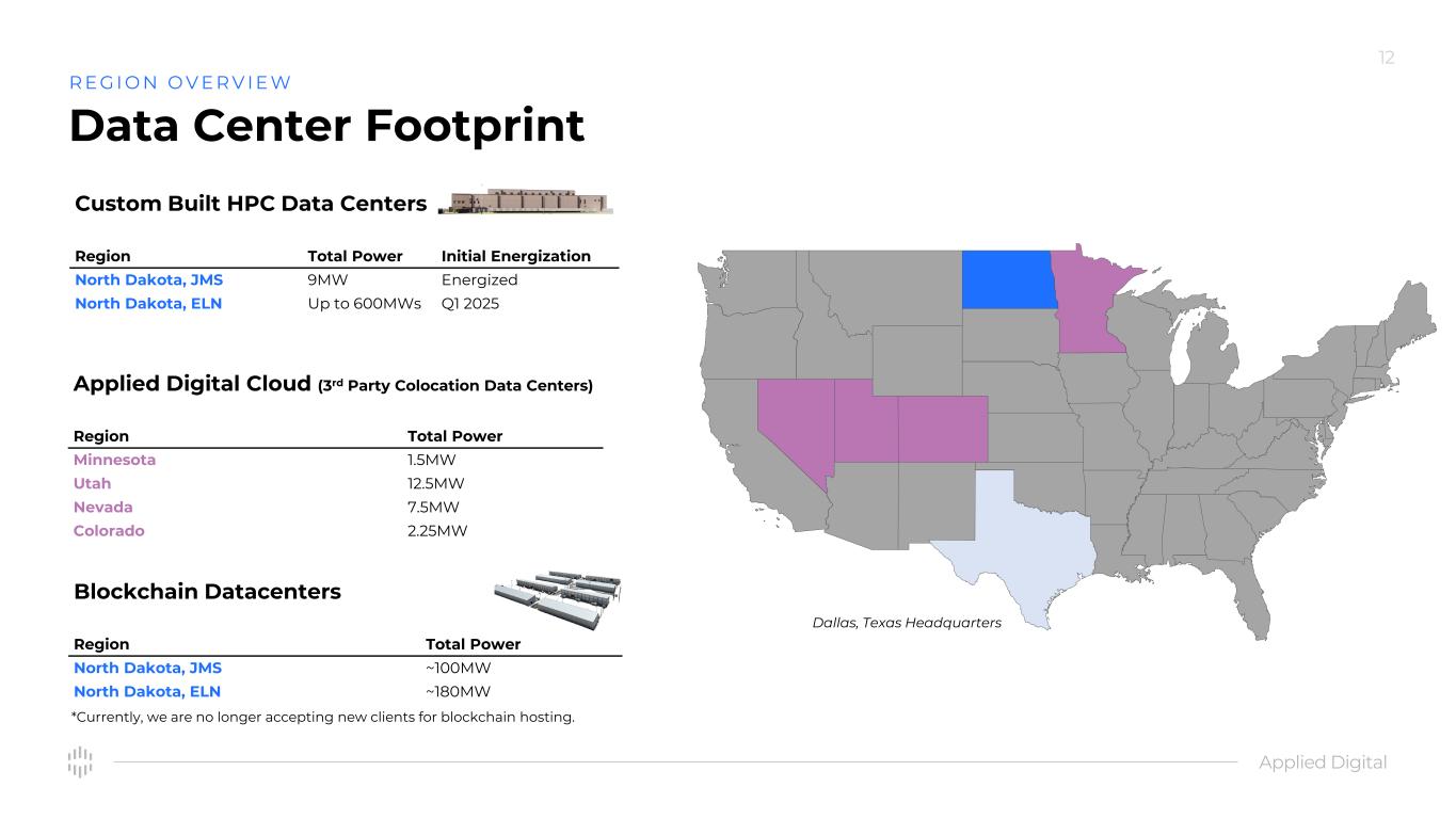 Custom Built HPC Data Centers Region Total Power Initial Energization North Dakota, JMS 9MW Energized North Dakota, ELN Up to 600MWs Q1 2025 R E G I O N O V E R V I E W Applied Digital Cloud (3rd Party Colocation Data Centers) Region Total Power Minnesota 1.5MW Utah 12.5MW Nevada 7.5MW Colorado 2.25MW Blockchain Datacenters Region Total Power North Dakota, JMS ~100MW North Dakota, ELN ~180MW Data Center Footprint Dallas, Texas Headquarters *Currently, we are no longer accepting new clients for blockchain hosting.