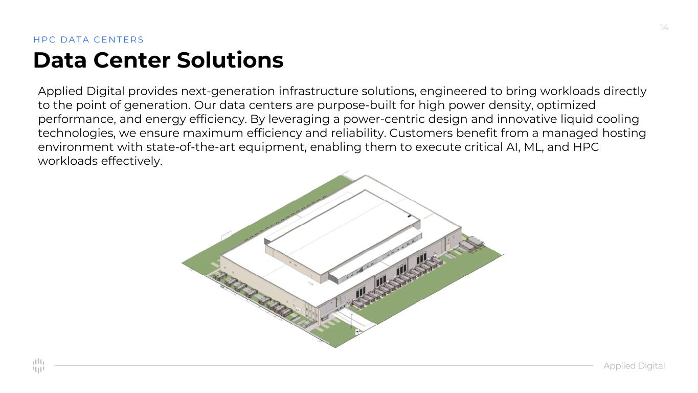 H P C D A T A C E N T E R S Data Center Solutions Applied Digital provides next-generation infrastructure solutions, engineered to bring workloads directly to the point of generation. Our data centers are purpose-built for high power density, optimized performance, and energy efficiency. By leveraging a power-centric design and innovative liquid cooling technologies, we ensure maximum efficiency and reliability. Customers benefit from a managed hosting environment with state-of-the-art equipment, enabling them to execute critical AI, ML, and HPC workloads effectively.