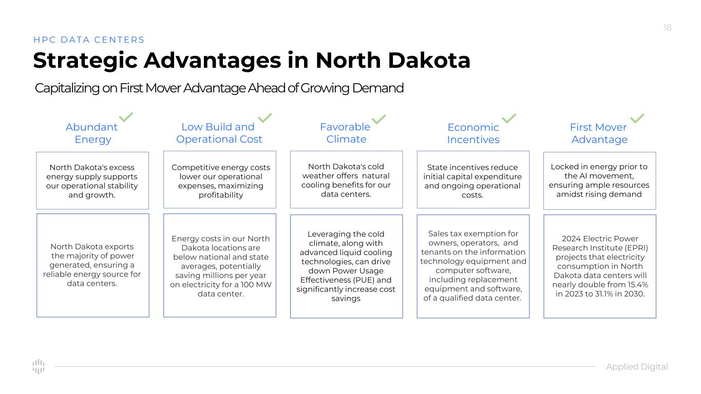 H P C D A T A C E N T E R S Strategic Advantages in North Dakota Capitalizing on First Mover Advantage Ahead of Growing Demand Abundant Energy Low Build and Operational Cost Favorable Climate Economic Incentives First Mover Advantage North Dakota's excess energy supply supports our operational stability and growth. Competitive energy costs lower our operational expenses, maximizing profitability State incentives reduce initial capital expenditure and ongoing operational costs. Locked in energy prior to the AI movement, ensuring ample resources amidst rising demand 2024 Electric Power Research Institute (EPRI) projects that electricity consumption in North Dakota data centers will nearly double from 15.4% in 2023 to 31.1% in 2030. Sales tax exemption for owners, operators, and tenants on the information technology equipment and computer software, including replacement equipment and software, of a qualified data center. Energy costs in our North Dakota locations are below national and state averages, potentially saving millions per year on electricity for a 100 MW data center. North Dakota exports the majority of power generated, ensuring a reliable energy source for data centers. North Dakota's cold weather offers natural cooling benefits for our data centers. Leveraging the cold climate, along with advanced liquid cooling technologies, can drive down Power Usage Effectiveness (PUE) and significantly increase cost savings