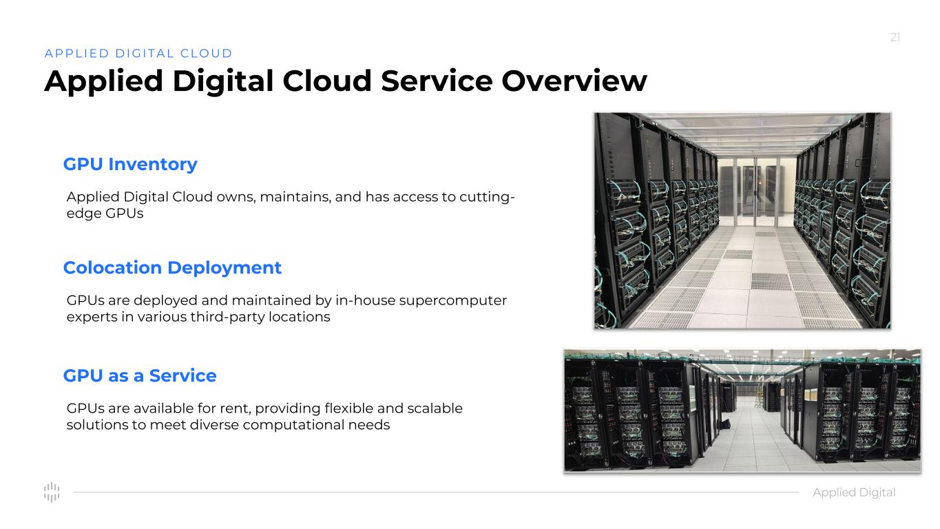 A P P L I E D D I G I T A L C L O U D Applied Digital Cloud Service Overview GPU Inventory Applied Digital Cloud owns, maintains, and has access to cutting- edge GPUs Colocation Deployment GPUs are deployed and maintained by in-house supercomputer experts in various third-party locations GPU as a Service GPUs are available for rent, providing flexible and scalable solutions to meet diverse computational needs