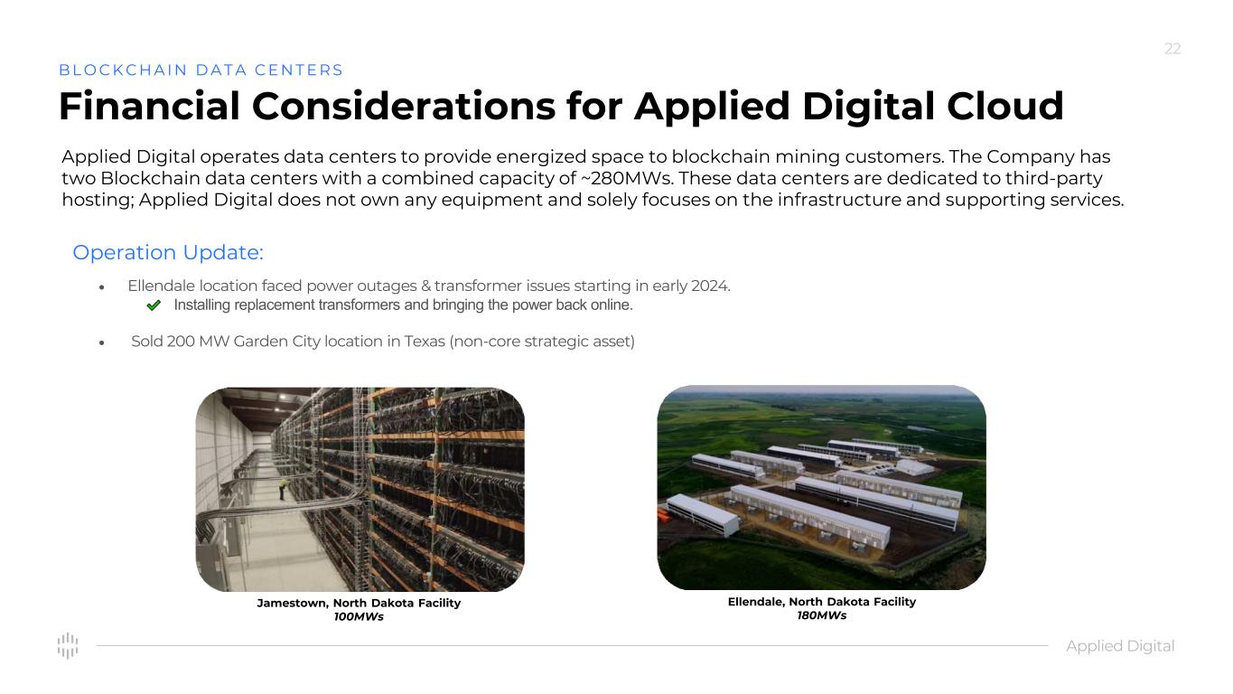 B L O C K C H A I N D A T A C E N T E R S Financial Considerations for Applied Digital Cloud Jamestown, North Dakota Facility 100MWs Ellendale, North Dakota Facility 180MWs Applied Digital operates data centers to provide energized space to blockchain mining customers. The Company has two Blockchain data centers with a combined capacity of ~280MWs. These data centers are dedicated to third-party hosting; Applied Digital does not own any equipment and solely focuses on the infrastructure and supporting services. Operation Update: • Ellendale location faced power outages & transformer issues starting in early 2024. Installing replacement transformers and bringing the power back online. • Sold 200 MW Garden City location in Texas (non-core strategic asset)