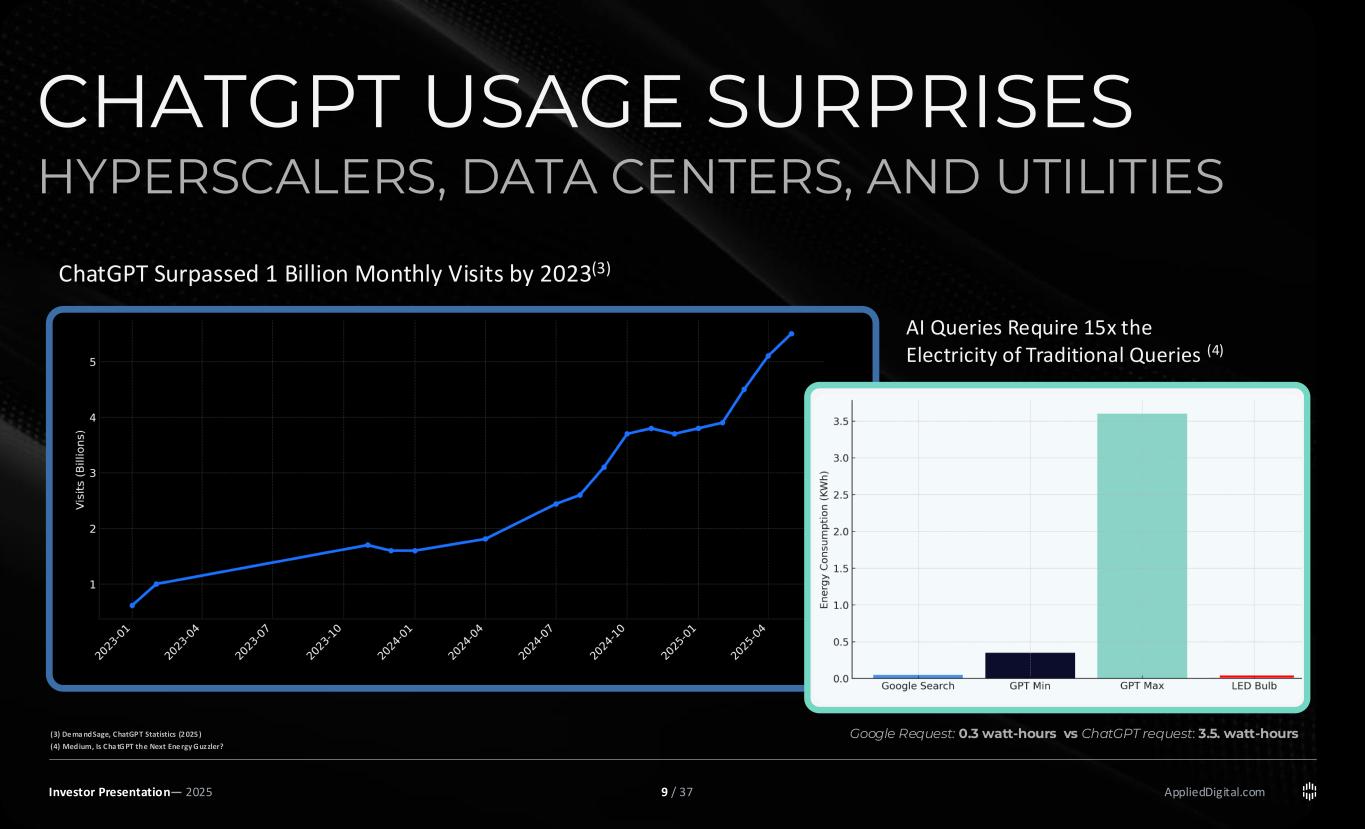 AppliedDigital.com CHATGPT USAGE SURPRISES HYPERSCALERS, DATA CENTERS, AND UTILITIES Investor Presentation— 2025 Google Request: 0.3 watt-hours vs ChatGPT request: 3.5. watt-hours AI Queries Require 15x the Electricity of Traditional Queries (4) ChatGPT Surpassed 1 Billion Monthly Visits by 2023(3) (3) De ma ndSage, ChatGPT Statistics (2 025 ) (4) Medium, Is Cha tGPT the Next Ene rgy Guzzler? 9 / 37